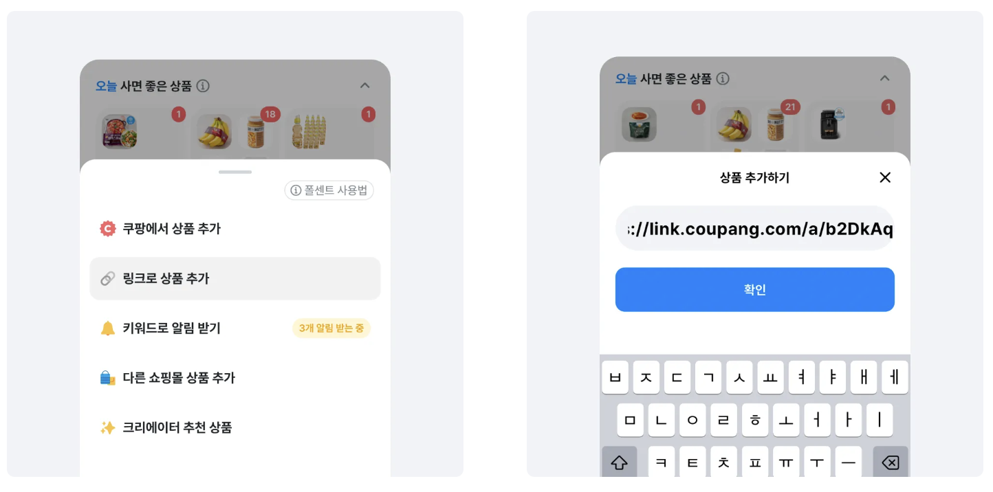 폴센트 앱 하단의 +버튼 → [링크로 상품 추가] → 붙여넣기해 주세요.