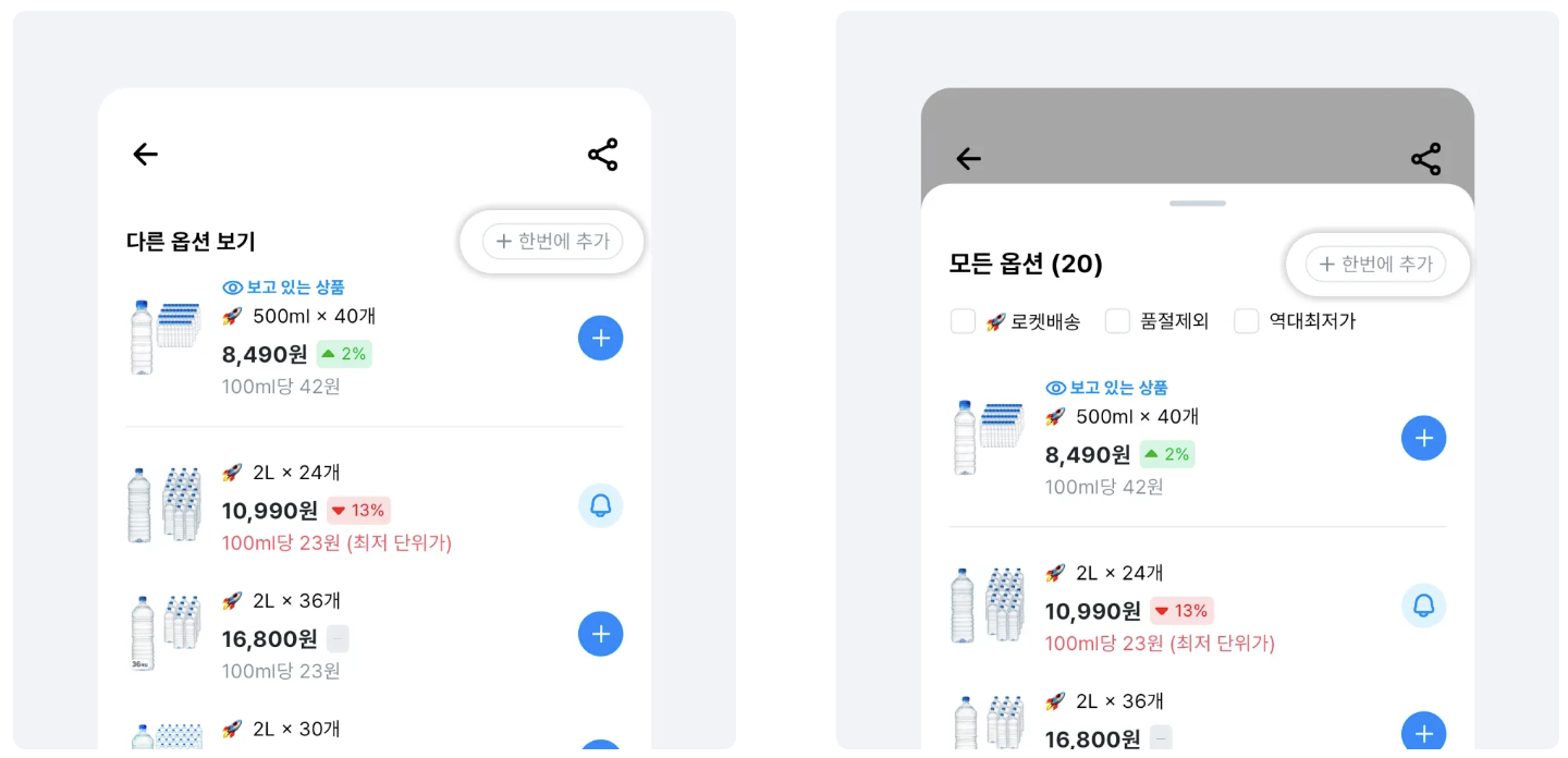 + 한번에 추가 를 눌러 모든 옵션 상품을 한번에 추가할 수 있어요.