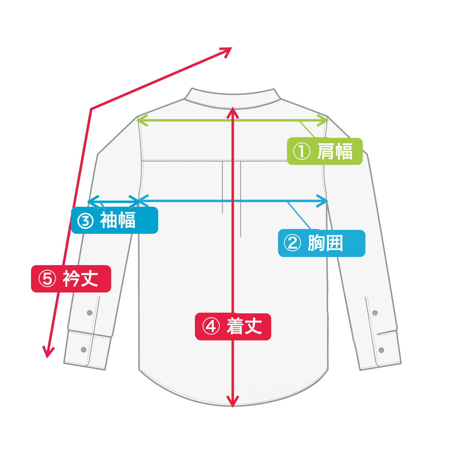 肩幅:左右の肩先の縫い目から縫い目までの横幅①胸囲:前身頃の脇下の付け根から1cm下の横幅②を2倍にした長さ袖幅:袖の付け根下から直角に測った長さ③着丈:バックネックポイントから裾まで④袖丈:肩先の縫い目から袖口までの長さ⑤