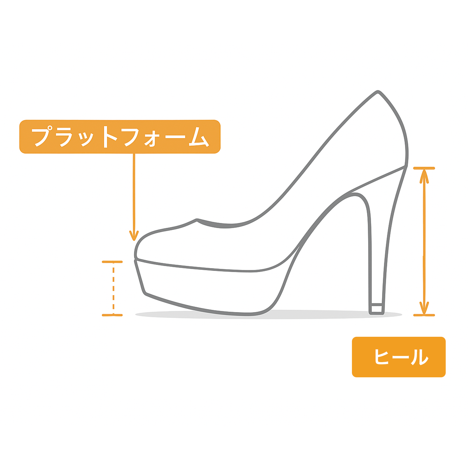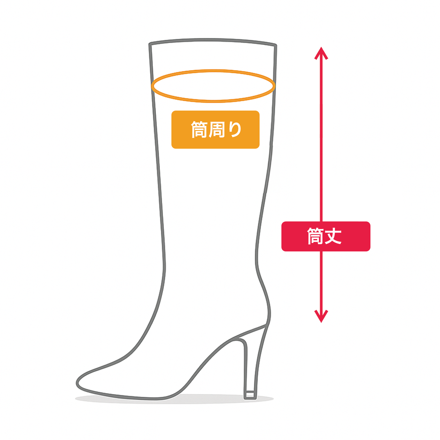 全長:アウトソールのつま先からかかとまでの長さアウトソール幅:アウトソールの横幅ヒール:地面から靴底までの長さプラットフォーム:ソールの厚さ筒丈:ヒールの境目から履き口までの長さ筒周り:履き口周りの内寸、または、足首周り~履き口周りの内寸
