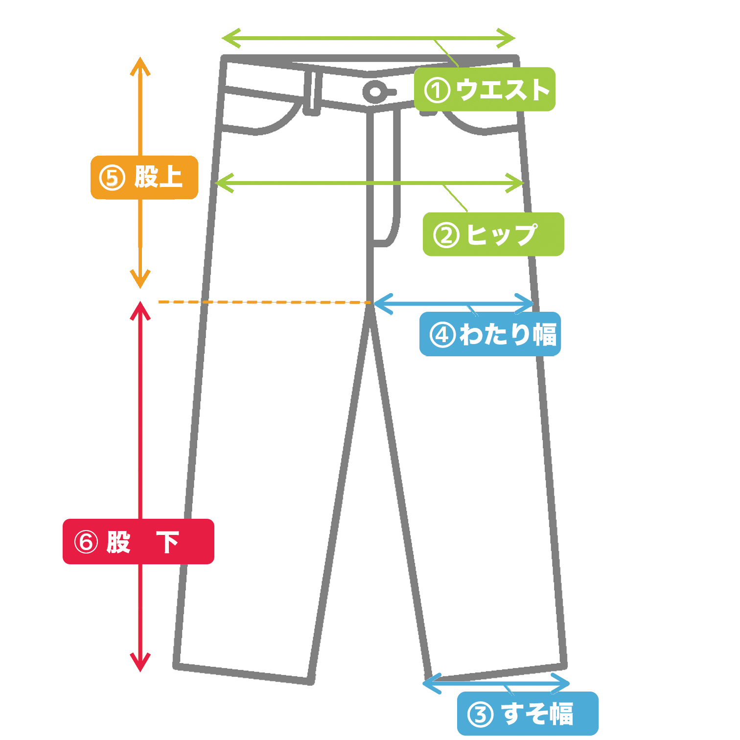 ウエスト:ウエストライン①の両脇間を2倍にした長さ※範囲表記の場合、ウエストゴムを伸ばしたときの両脇間を2倍にした長さが最大値ヒップ:ファスナーの開き止まり位置の両脇②をまっすぐ測り、2倍した長さすそ周り:すそ幅③を2倍した長さもも周り:わたり幅④を2倍した長さ股上:上端から内股合わせまでの長さ⑤股下:内股合わせから裾までの長さ⑥総丈:上端から裾までの長さ⑤+⑥