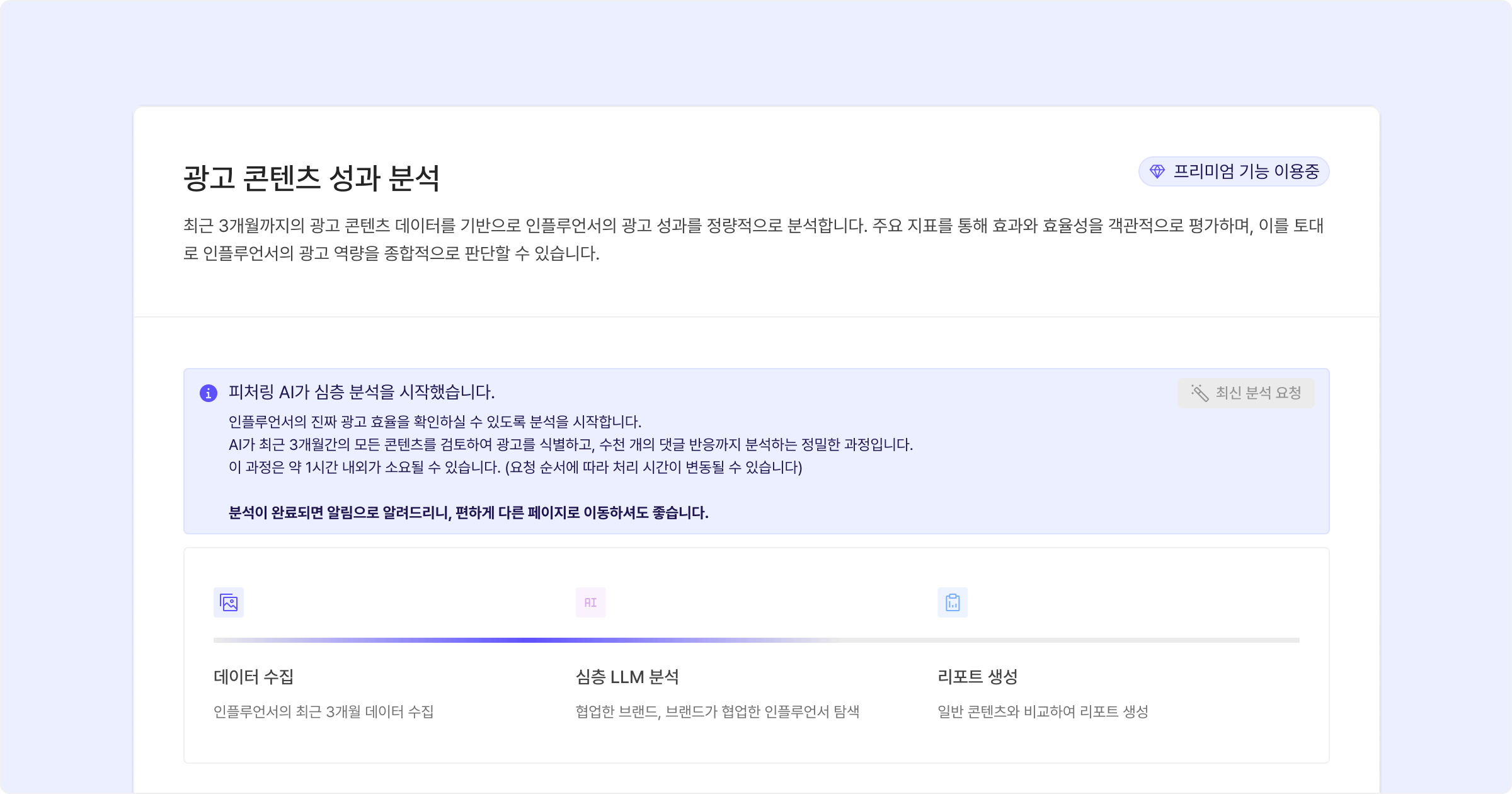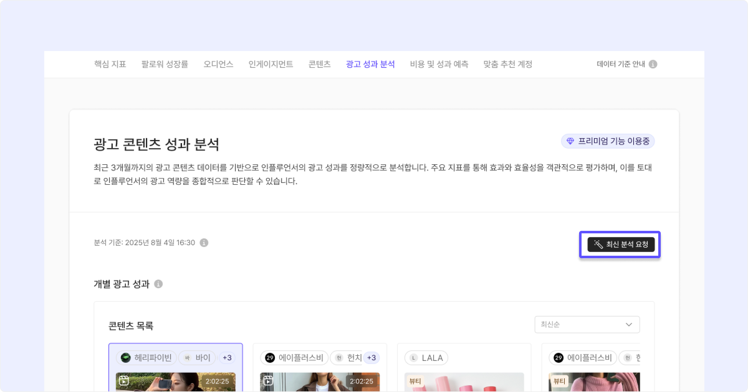 리포트에 최신 데이터가 모두 보이지 않나요? 이미 분석 결과가 있더라도 해당 버튼을 통해 최신 분석 요청 시 인플루언서의 광고 콘텐츠 데이터를 다시 수집하여 최신 기준으로 성과를 계산합니다.