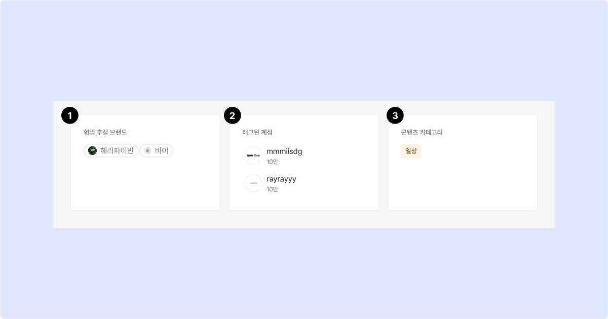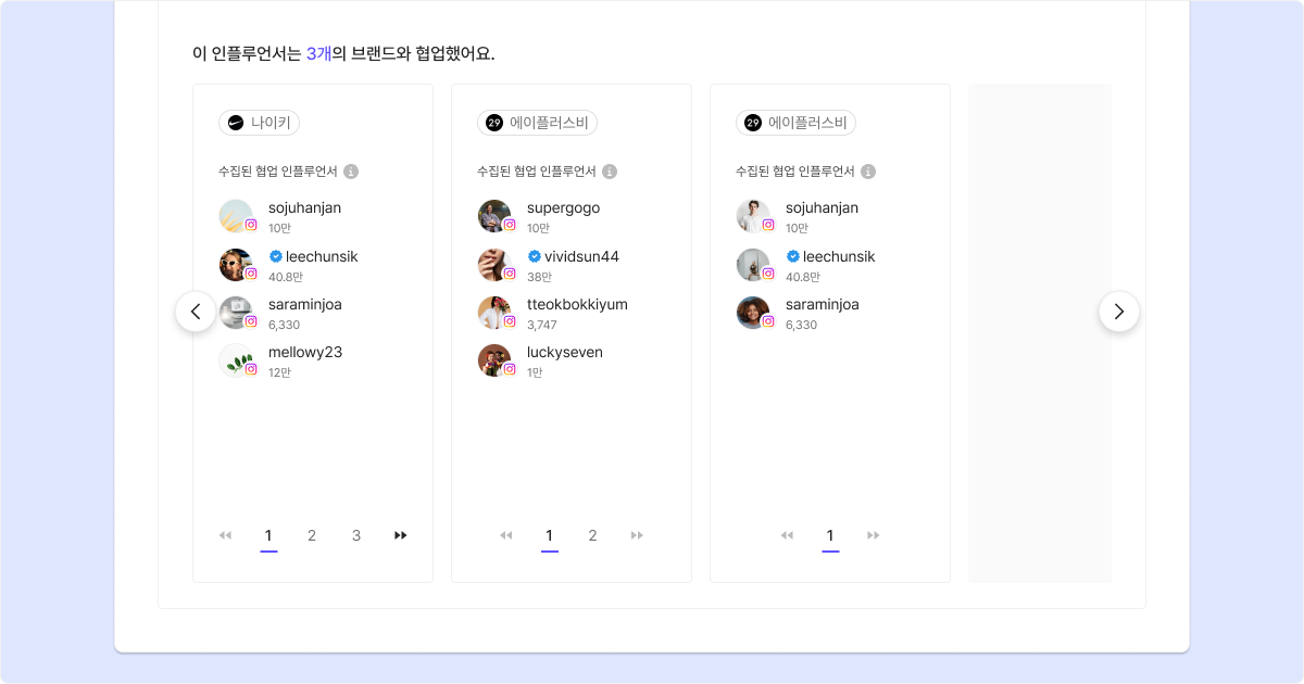 수집된 협업 인플루언서: 각 브랜드 카드 안에는, 해당 브랜드와 협업한 다른 인플루언서 목록이 나타납니다. 이를 통해 아래와 같은 전략적 인사이트를 얻을 수 있습니다.