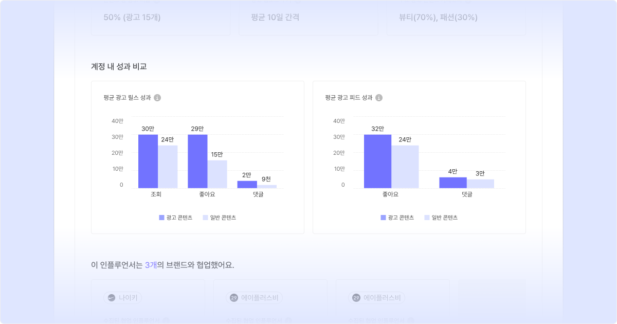 특정 광고 콘텐츠 하나가 얼마나 효과적이었는지, 해당 인플루언서의 다른 광고 콘텐츠 평균과 비교하여 객관적으로 평가할 수 있습니다.