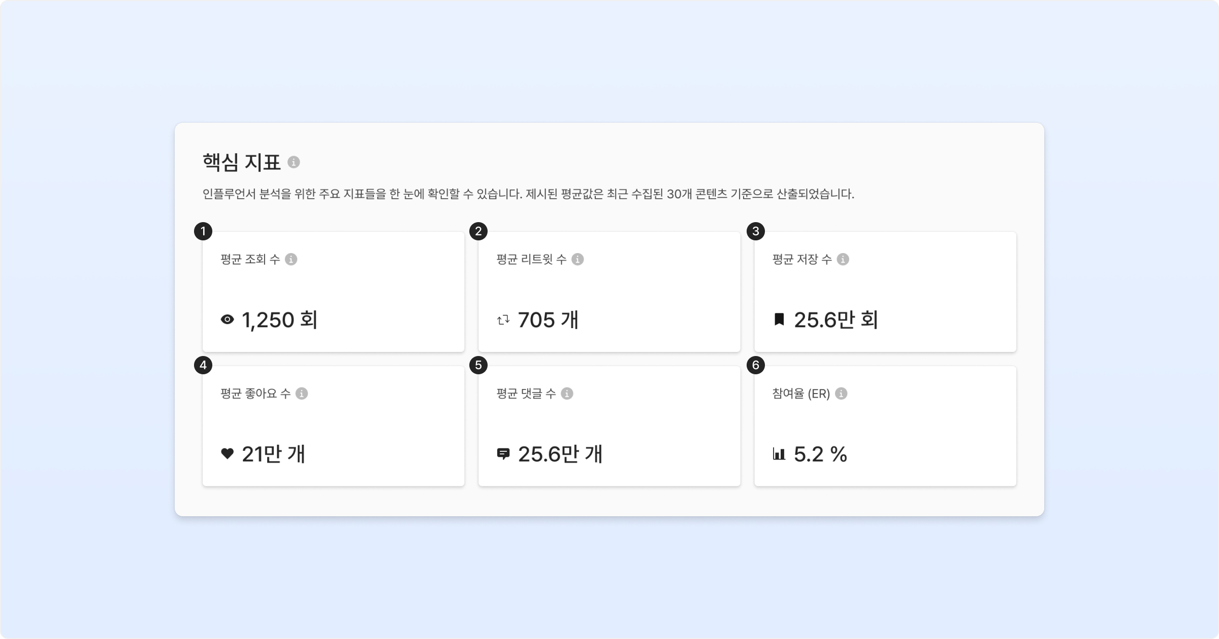 인플루언서 분석을 위한 주요 지표들을 한 눈에 확인할 수 있습니다. 인플루언서의 효율성과 영향력을 정량적으로 측정하는 핵심 지표입니다. 지표에 대한 더 자세한 분석은 각각의 섹션에서 확인할 수 있습니다.
