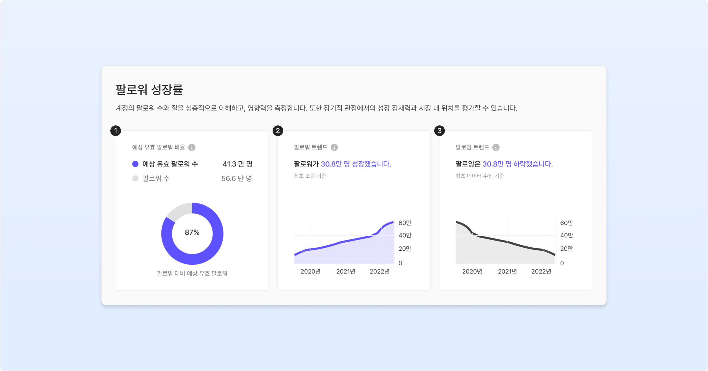 계정의 팔로워 수와 질을 심층적으로 이해하고, 영향력을 측정합니다. 또한 장기적 관점에서의 성장 잠재력과 시장 내 위치를 평가할 수 있습니다.