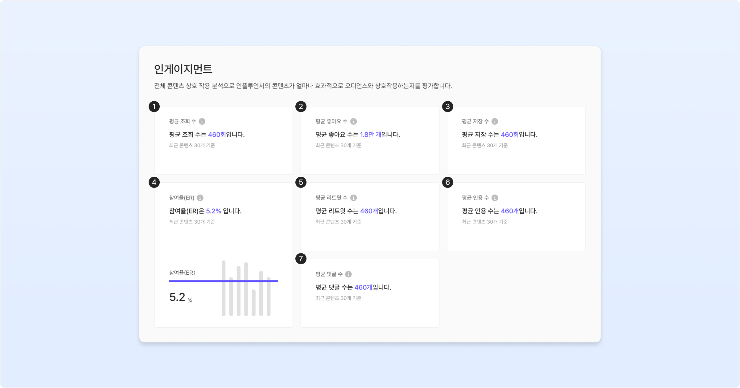 전체 콘텐츠 상호작용 분석으로 인플루언서의 콘텐츠가 얼마나 효과적으로 오디언스가 상호작용하는지를 평가할 수 있습니다.