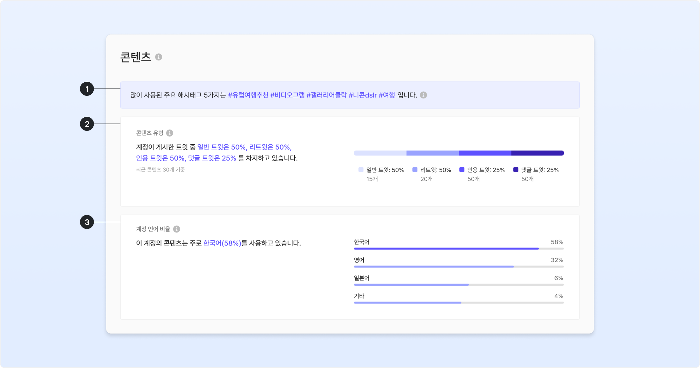 최근 30개의 콘텐츠를 기준으로 일반 트윗과 리트윗, 인용 트윗, 댓글 트윗의 비율을 보여줍니다. 계정의 콘텐츠가 주로 어떤 형식으로 게시되는지 파악할 수 있습니다.