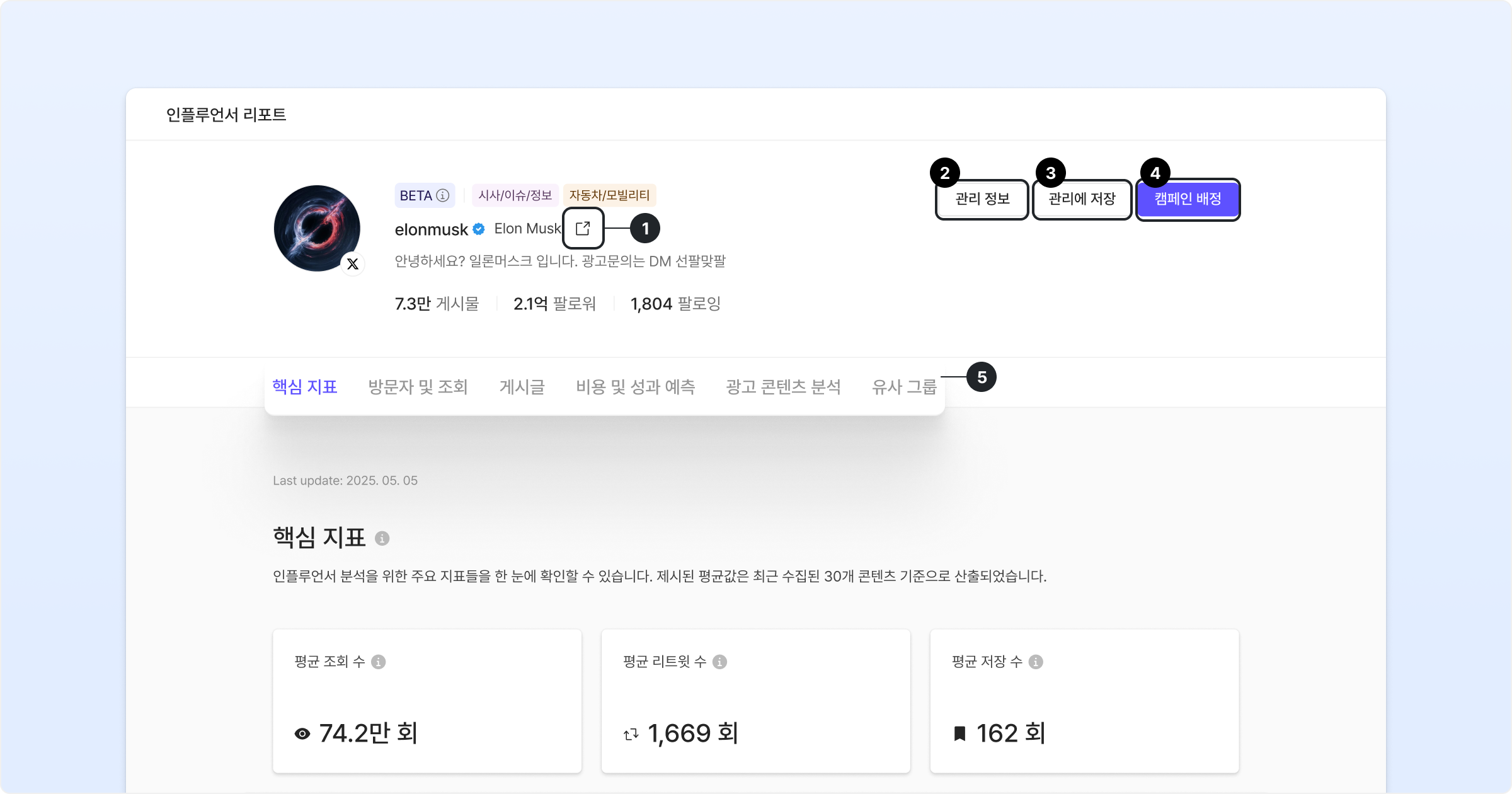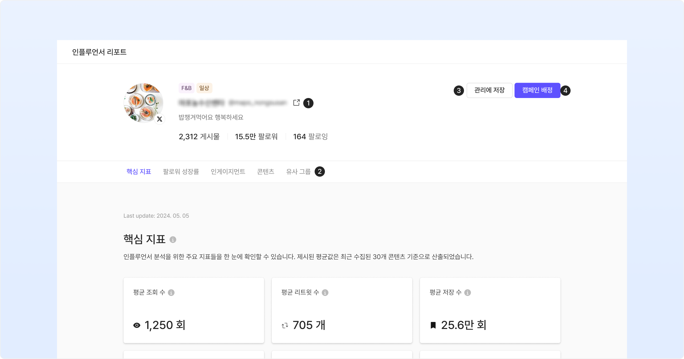 인플루언서의 평균 조회 수, 반응률 등 비즈니스에 꼭 필요한 다양한 지표를 포괄적으로 분석해 제공하기에 인플루언서의 실제 영향력을 파악하는데 도움이 됩니다.