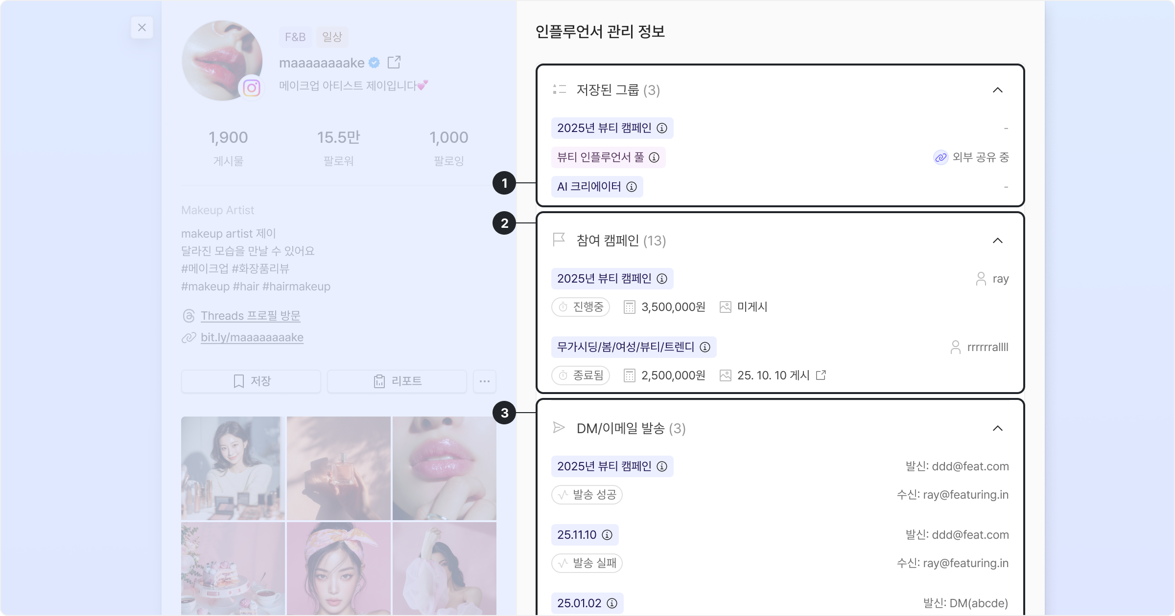 연관 기능 안내 • 인플루언서 그룹 – 그룹 정보, 외부 공유 설정, 커스텀 컬럼 등을 관리할 수 있습니다. • 캠페인 관리 – 캠페인별 인플루언서 배정, 일정, 성과 관리를 할 수 있습니다. • DM/이메일 발송 – 이메일 및 DM 발송 내역을 종합적으로 확인하고 재발송할 수 있습니다. |