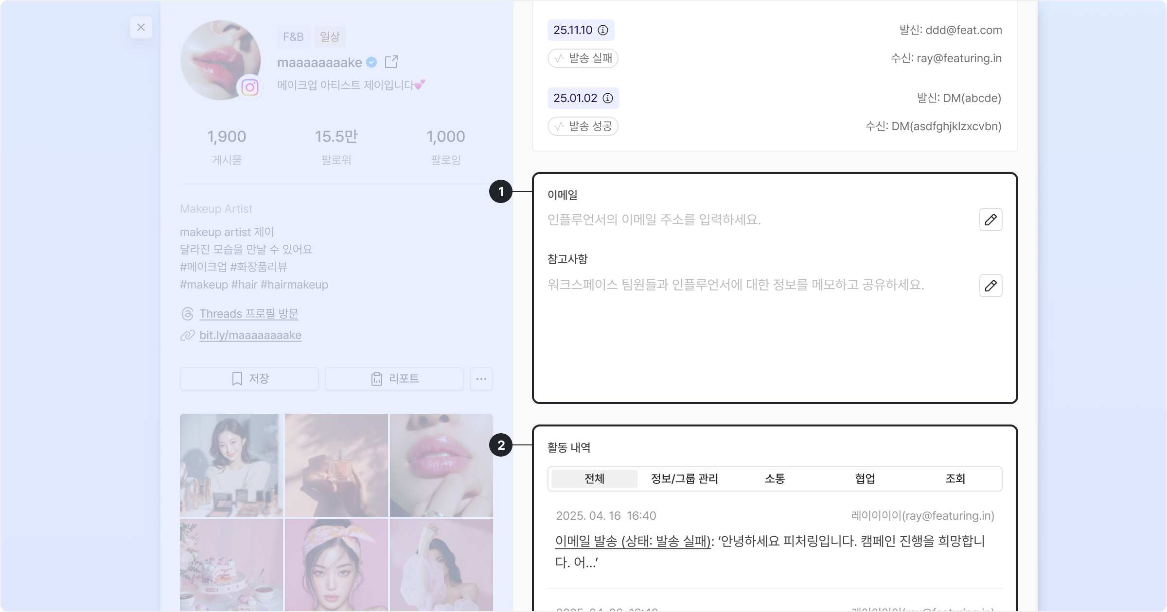이메일 입력란에서는 인플루언서의 연락 가능한 이메일 주소를 수기로 입력하거나 수정할 수 있습니다.