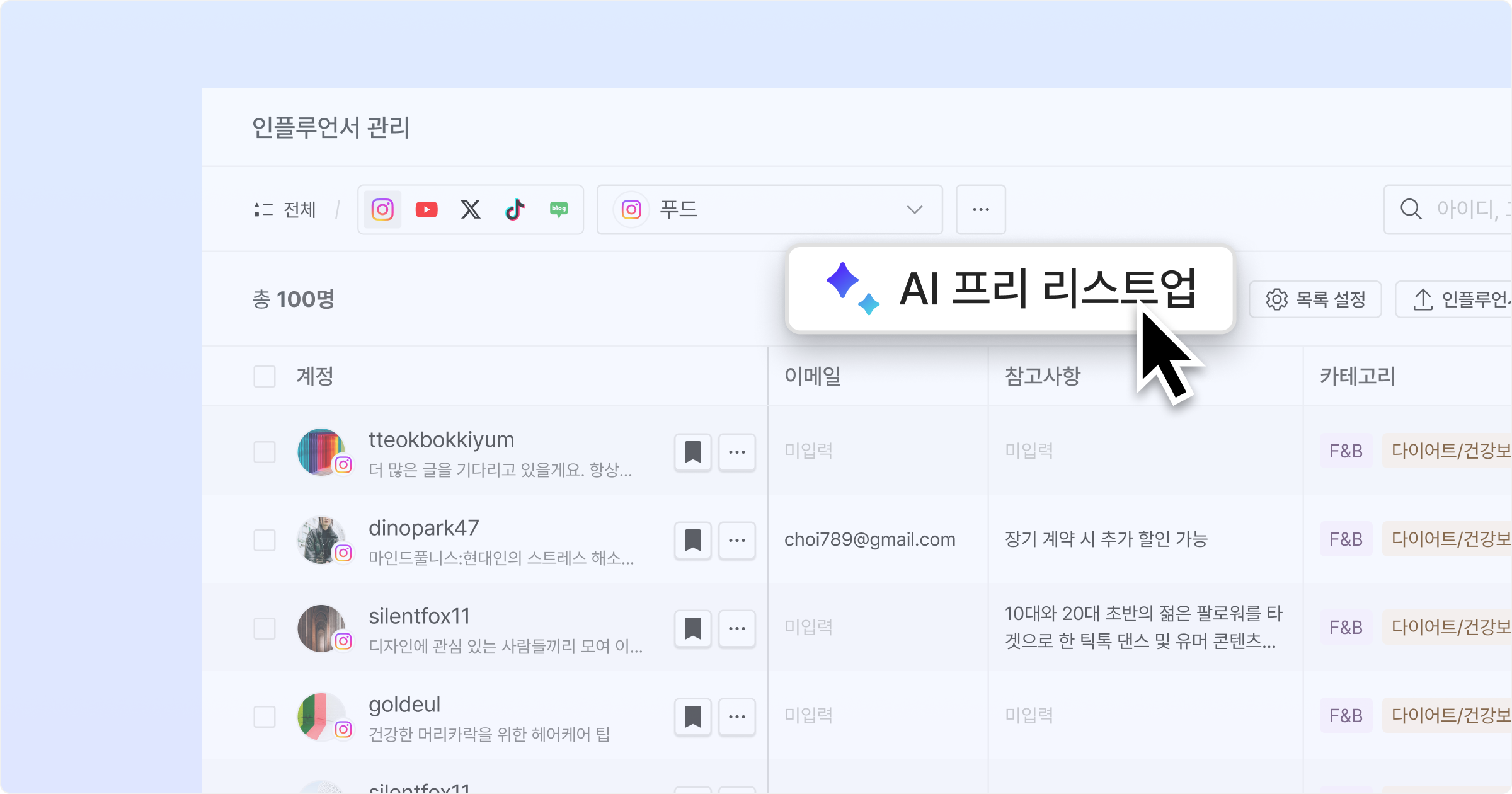 입력한 조건에 기반하여 AI가 프리 리스트업한 인플루언서 목록을 그룹에 자동으로 추가해 줍니다.