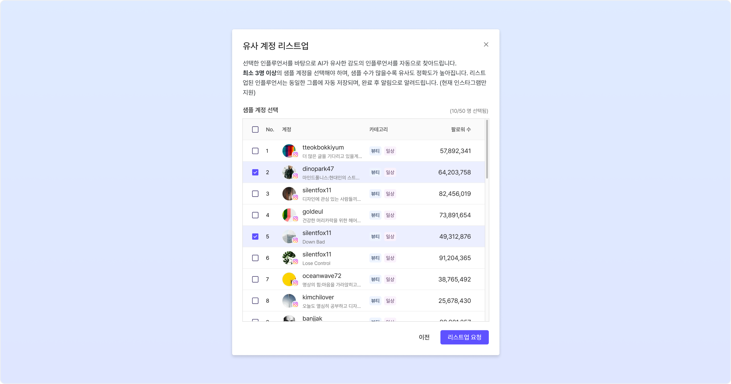 최소 3명 이상의 샘플 계정을 선택해야 하며, 샘플 수가 많을수록 인플루언서 목록의 유사도 정확도가 높아집니다.
