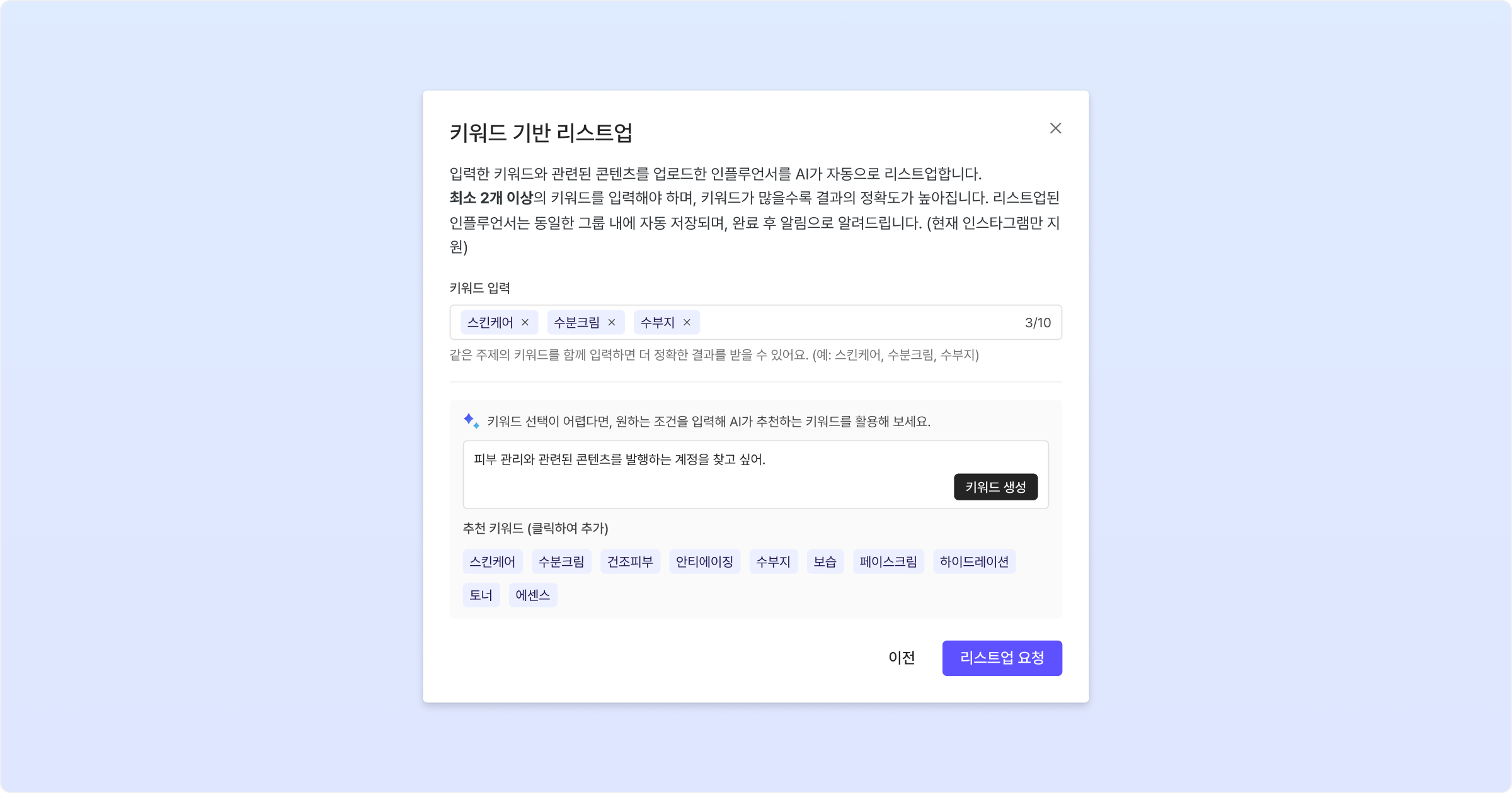 입력한 키워드와 관련된 콘텐츠를 업로드한 인플루언서를 AI가 자동으로 리스트업합니다.