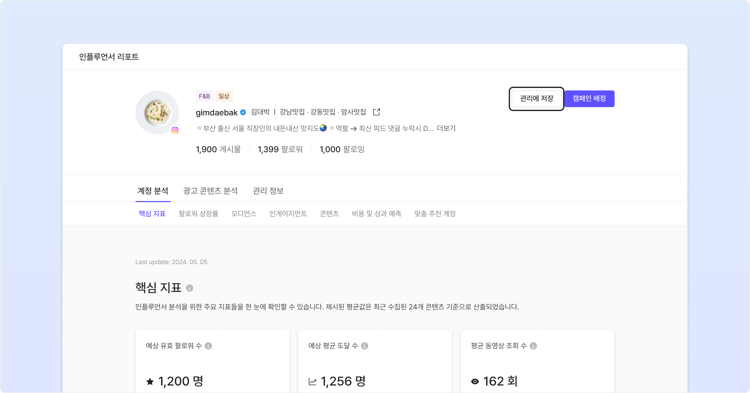 인플루언서의 상세 분석 리포트를 확인하는 과정에서 원하는 인플루언서를 발견하면 즉시 저장할 수 있습니다.