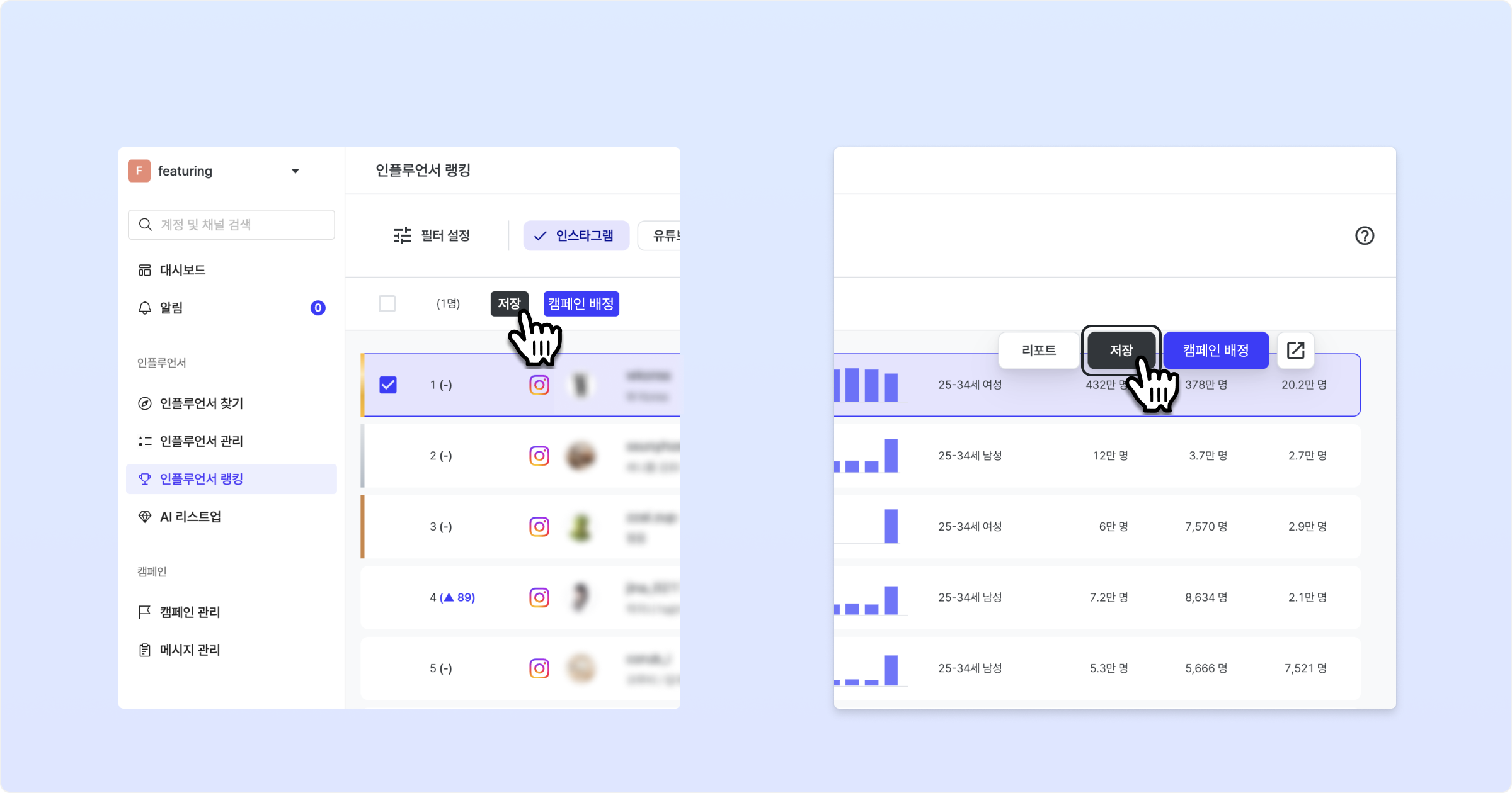원하는 인플루언서에 마우스를 올리면 저장 버튼이 나타나며, 이 버튼을 클릭하여 해당 인플루언서를 저장할 수 있습니다.