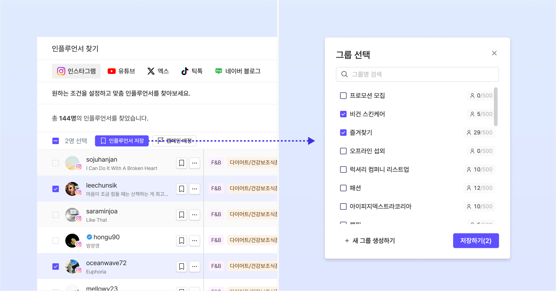 ※ 하나의 인플루언서를 여러 그룹에 동시에 저장할 수 있습니다.