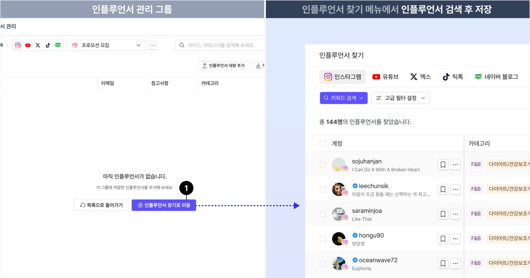 '인플루언서 찾기' 메뉴에서 새 인플루언서를 검색하고 저장하면, '인플루언서 관리' 메뉴의 그룹 내에 추가됩니다.