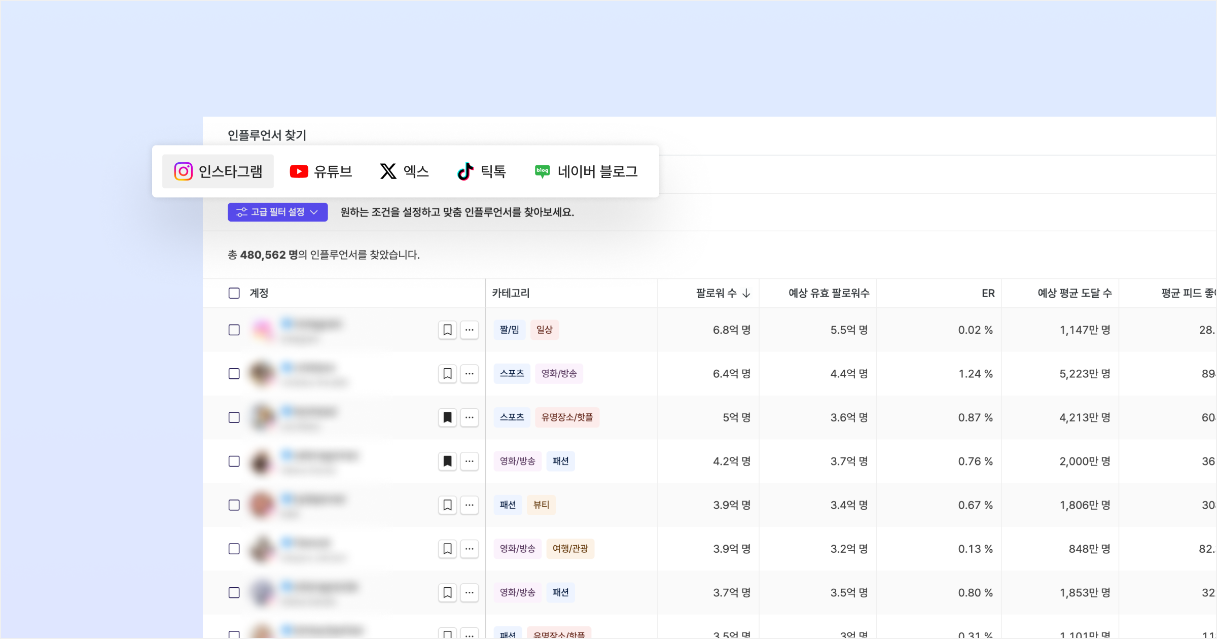 사용 방법: 원하는 플랫폼 탭을 클릭하여 해당 플랫폼의 인플루언서를 검색할 수 있습니다.