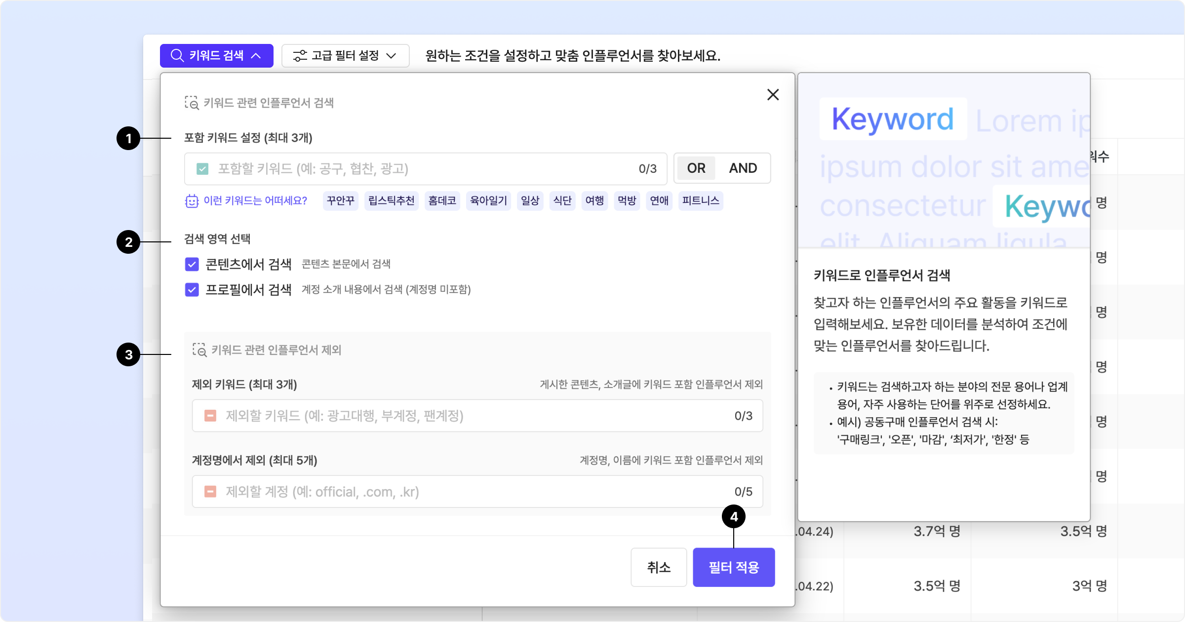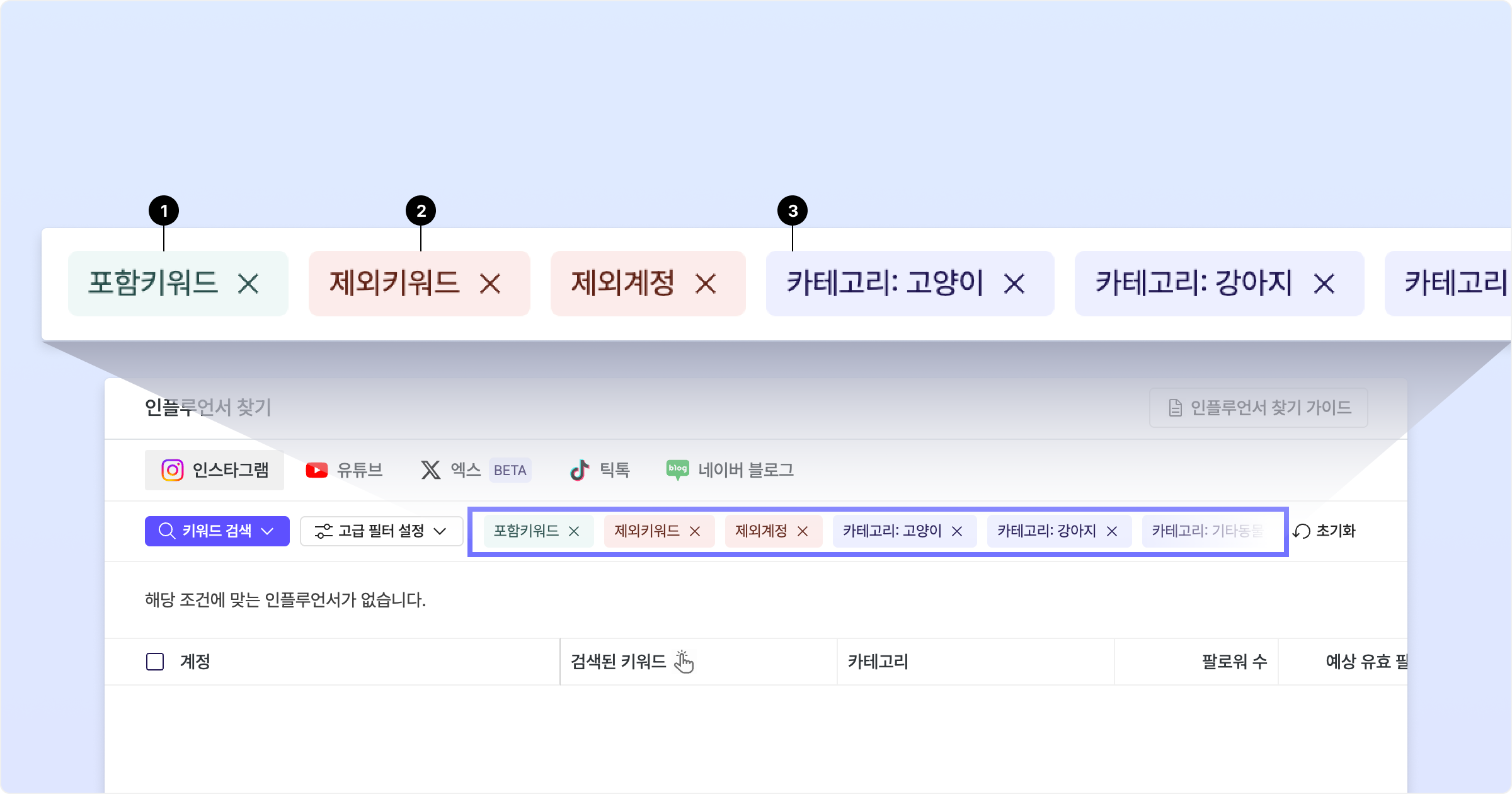 제외 키워드: 특정 단어를 포함한 인플루언서를 필터링하여 제외할 수 있습니다.