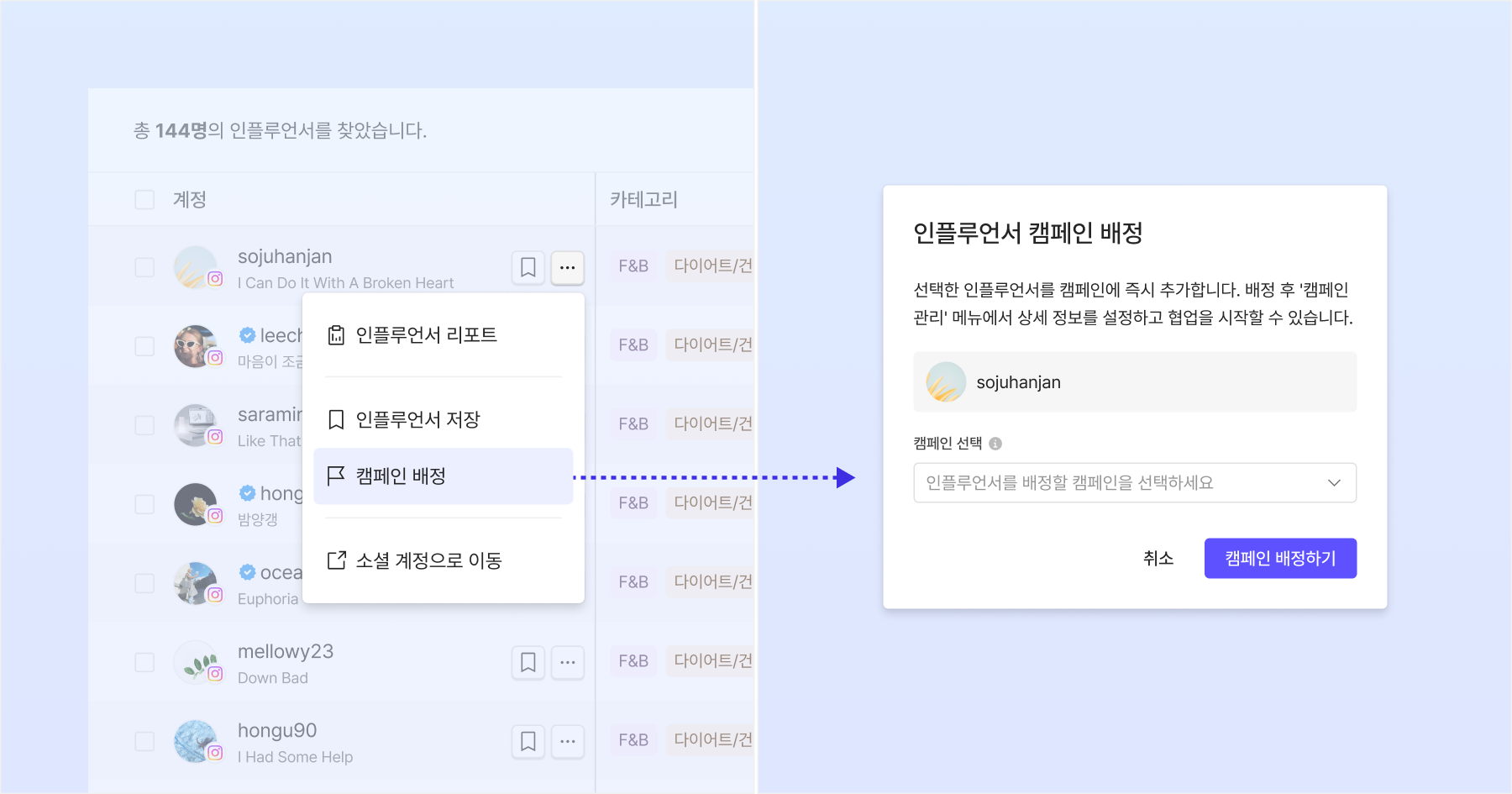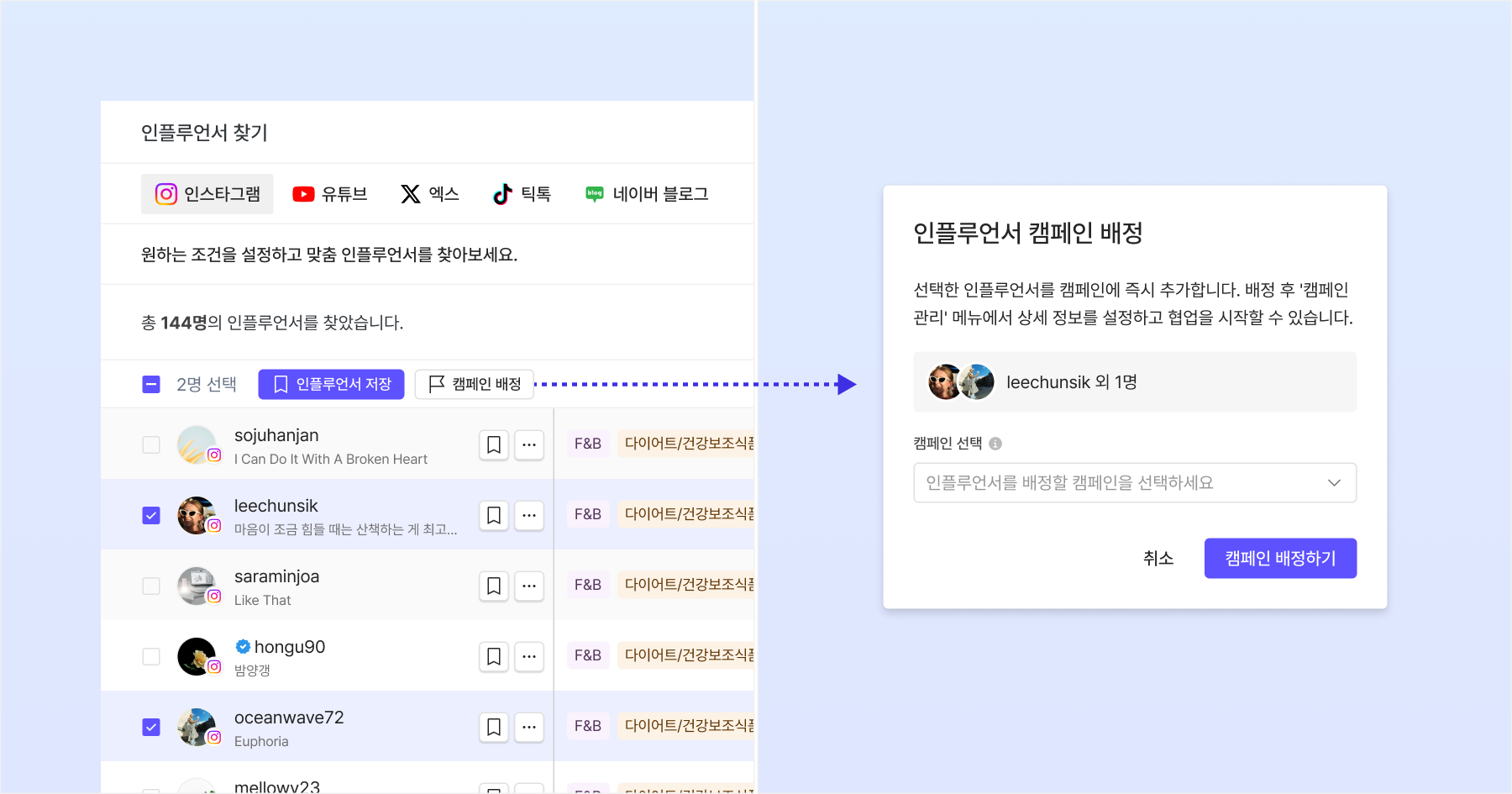 여러 인플루언서 체크박스 선택 > 상단 '캠페인 배정' 버튼 클릭 > 캠페인 선택 > '캠페인 배정하기' 클릭