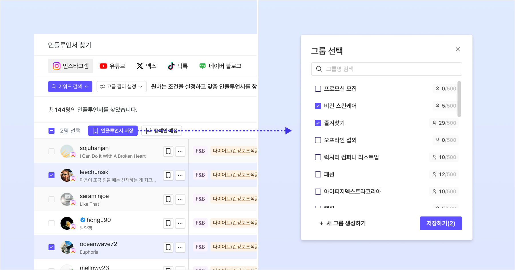 여러 인플루언서 체크박스 선택 > 상단 '인플루언서 저장' 버튼 클릭 > 그룹 선택 > '저장하기' 클릭