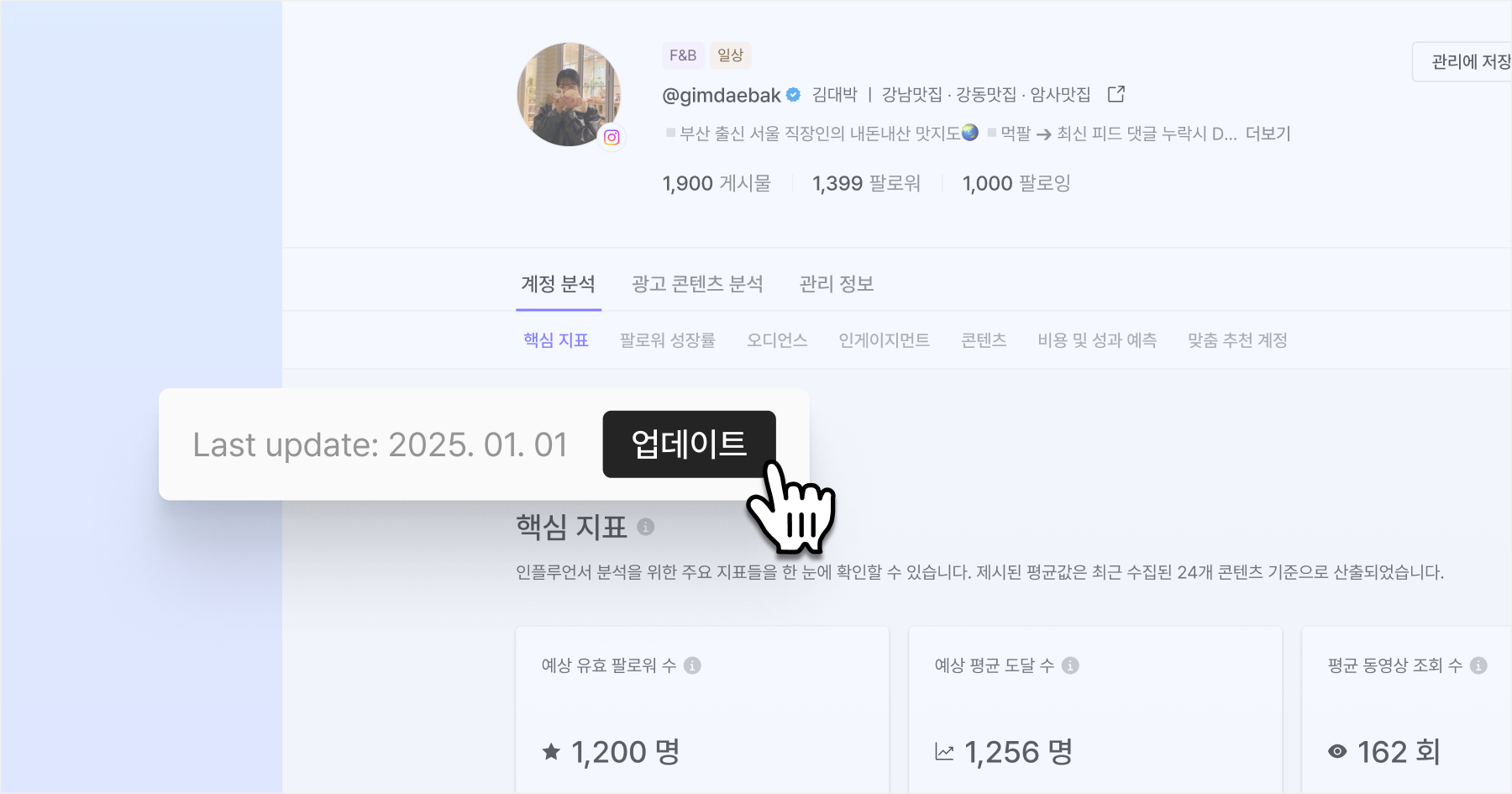 인플루언서 리포트에 ‘업데이트’ 버튼이 표시되는 경우, 클릭하여 최신 데이터로 갱신할 수 있습니다.