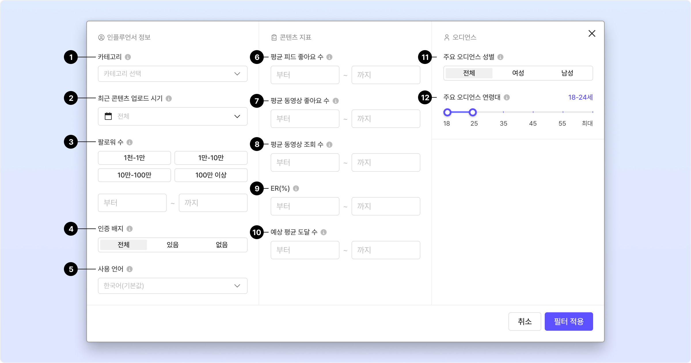 너무 많은 필터를 동시에 적용하면 조건이 지나치게 제한되어 적합한 인플루언서를 찾기 어려울 수 있습니다. 따라서 아래와 같은 방법을 추천드립니다: