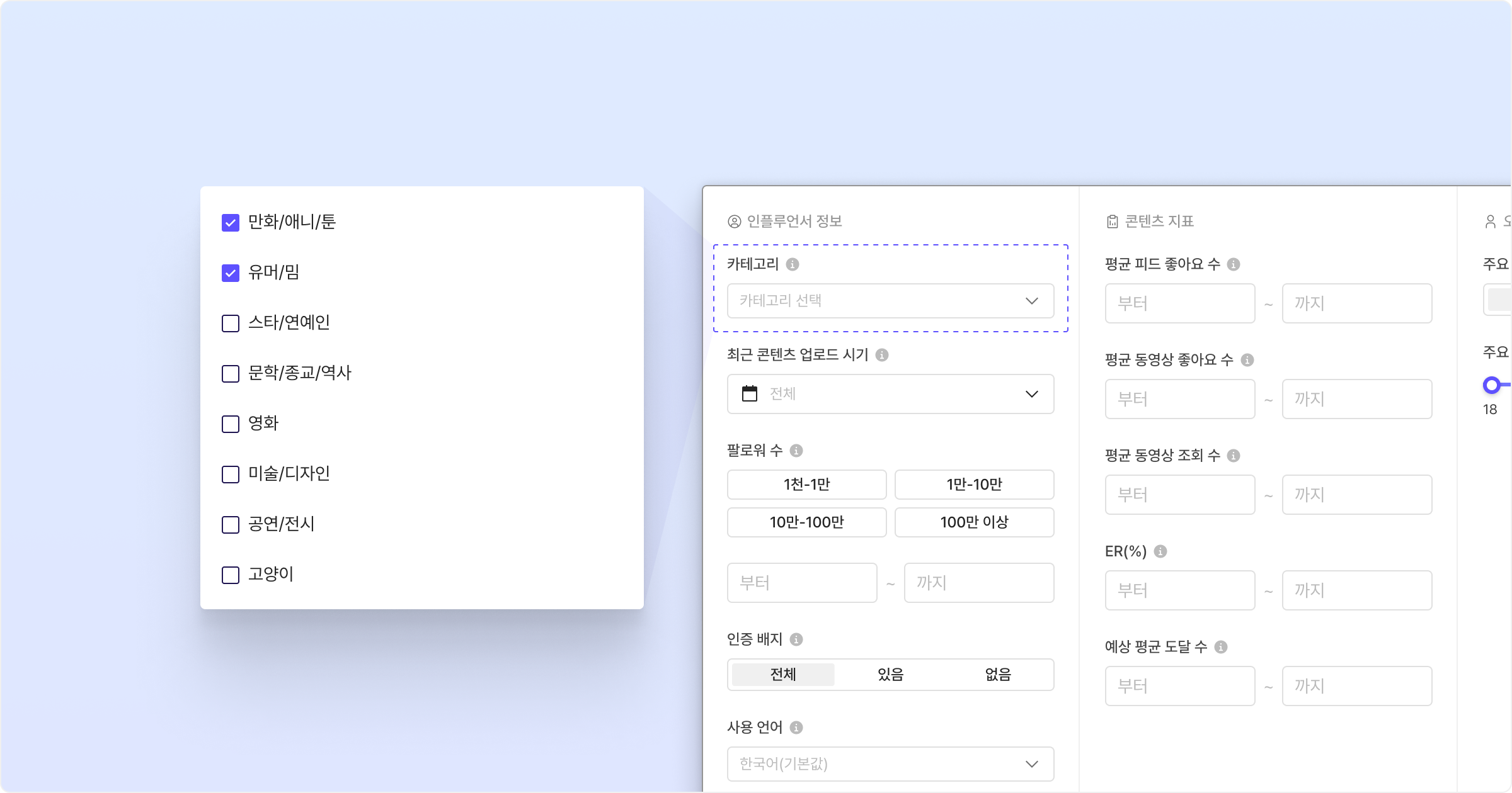 예를 들어 패션, 영화, 미술/디자인 등이 있을 수 있습니다. 이를 통해 브랜드의 제품이나 서비스와 가장 관련성 높은 분야의 인플루언서를 찾을 수 있습니다. 또한, 여러 카테고리를 동시에 선택할 수 있어, '뷰티'와 '라이프스타일' 두 카테고리에 모두 해당하는 인플루언서를 찾는 것도 가능합니다.