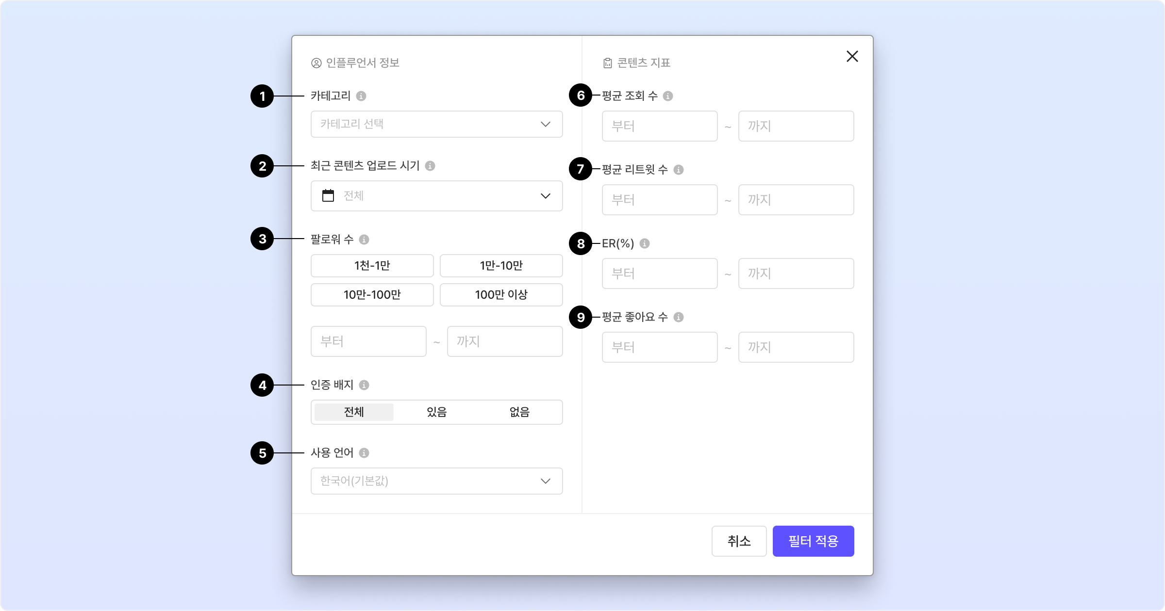 인플루언서의 팔로워 수 범위를 입력해 타겟팅을 최적화할 수 있습니다. 최대 2,000,000,000까지 입력 가능합니다.