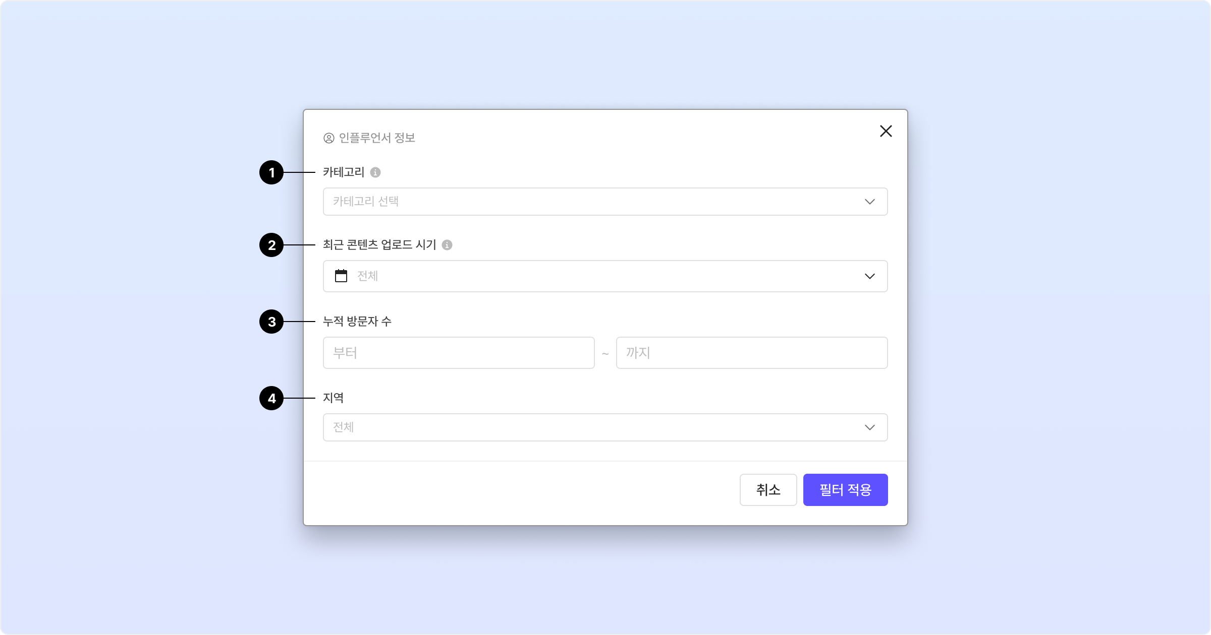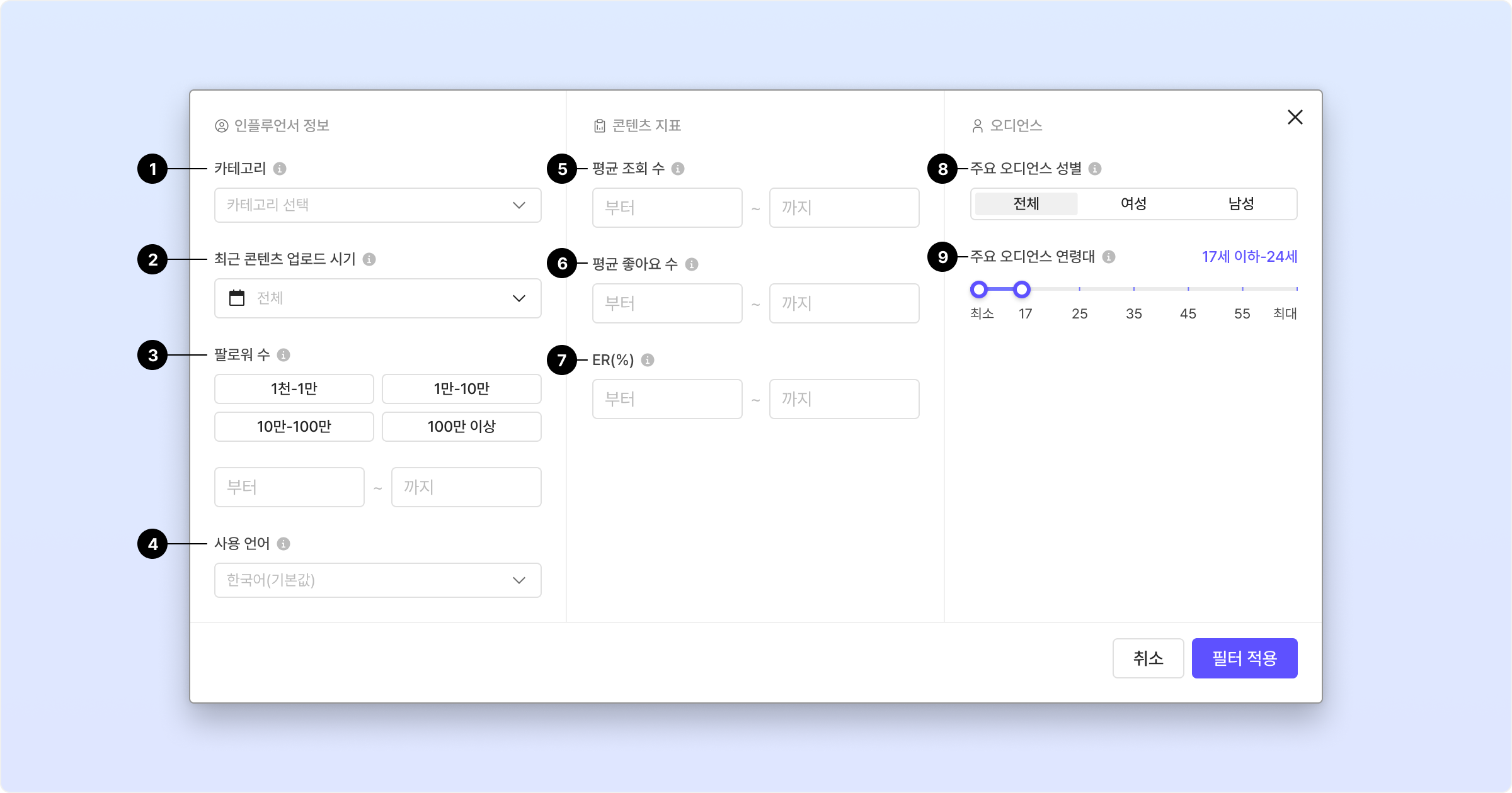 인플루언서의 구독자 수 범위를 입력해 타겟팅을 최적화할 수 있습니다.