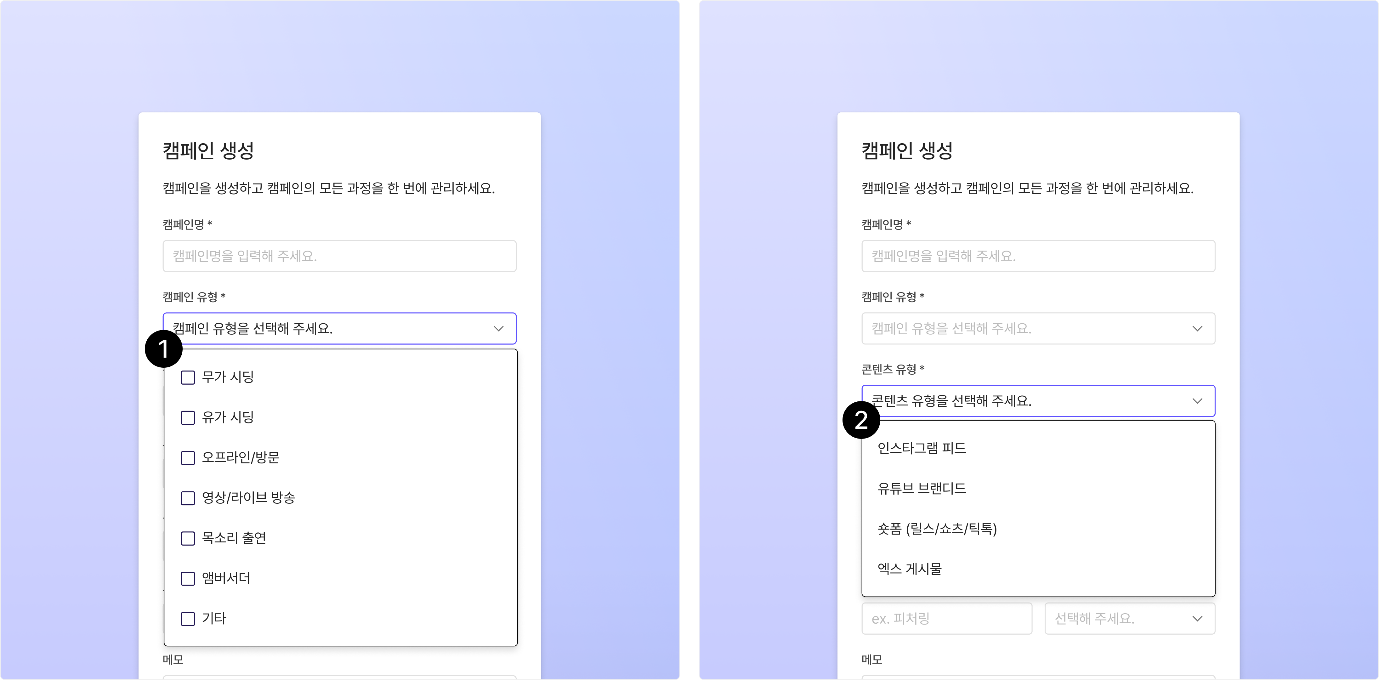 캠페인명 입력 후 ❶ 캠페인 유형 선택 → ❷ 콘텐츠 유형을 선택합니다.
