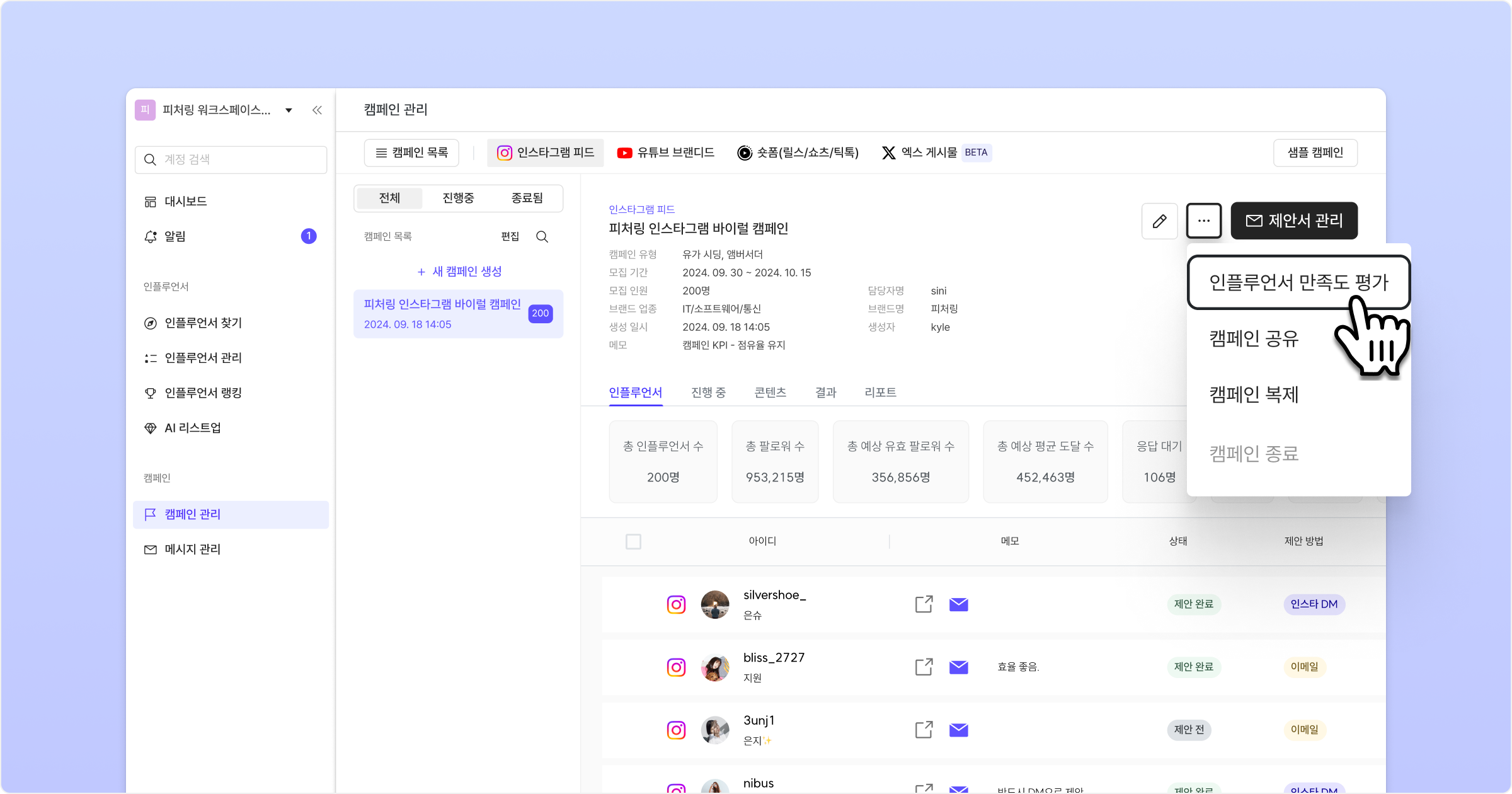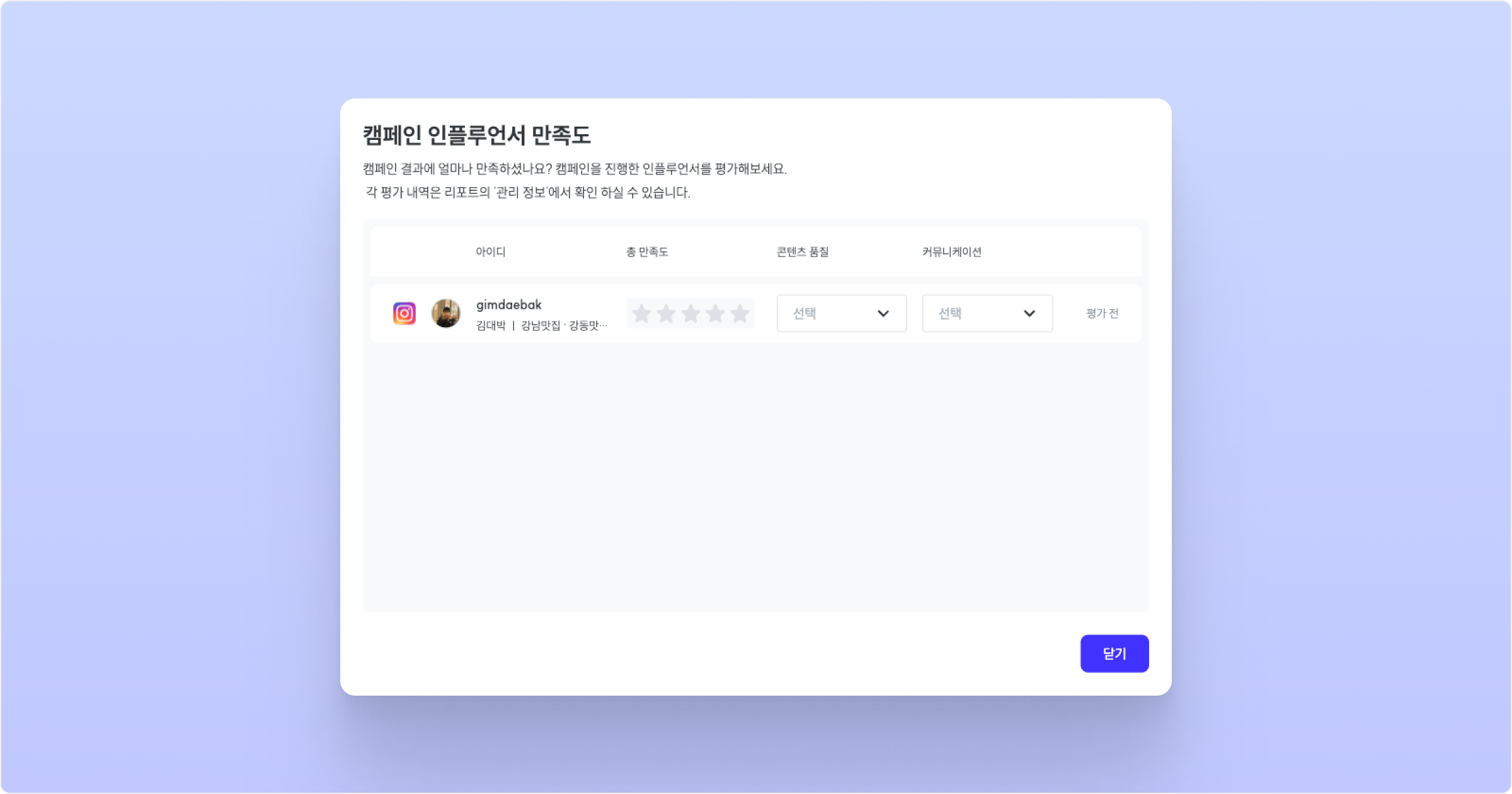 캠페인을 진행한 인플루언서의 콘텐츠 품질과 커뮤니케이션 만족도에 대해 평가할 수 있습니다.