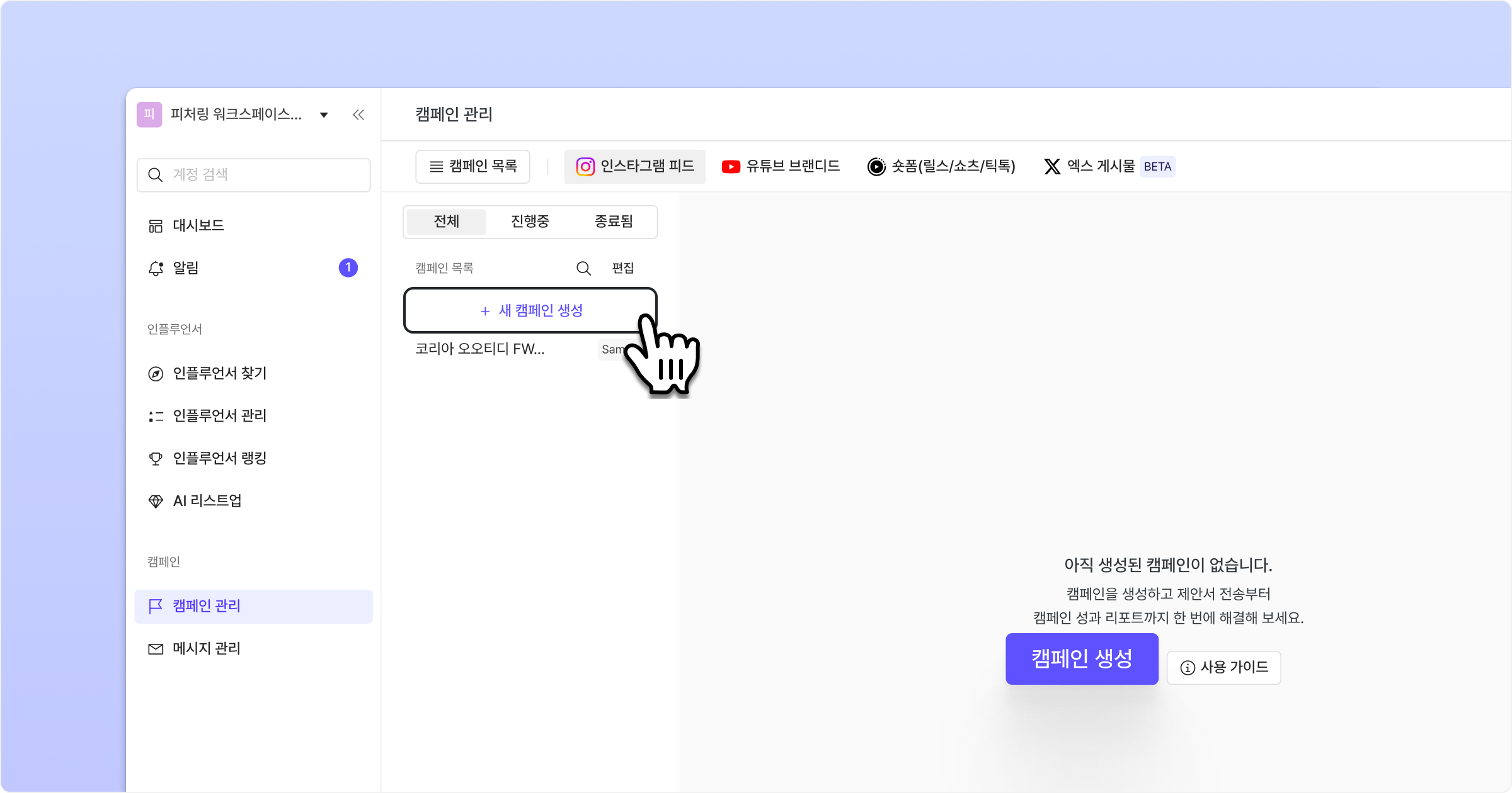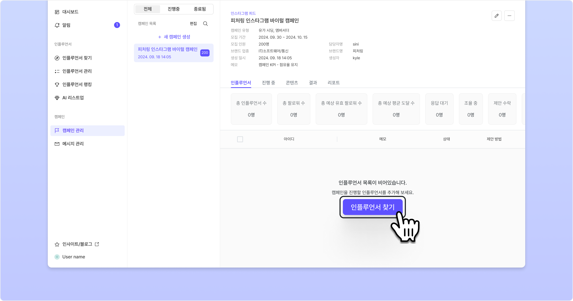 빈 캠페인 목록에서 인플루언서 찾기 버튼을 클릭하여 캠페인을 진행할 인플루언서를 찾습니다. 원하는 인플루언서 선택 후 캠페인 배정하기를 클릭해 캠페인에 인플루언서를 추가할 수 있습니다.