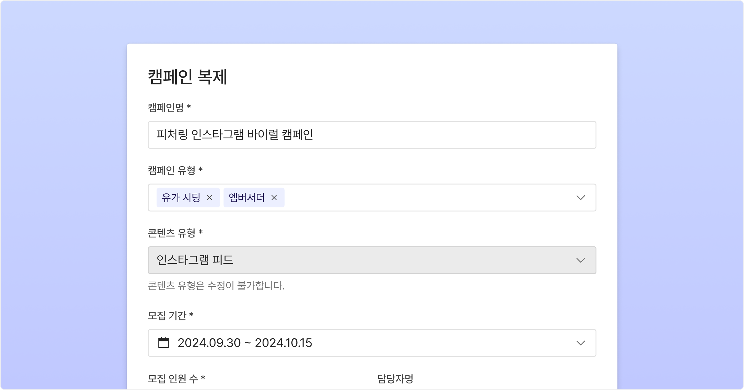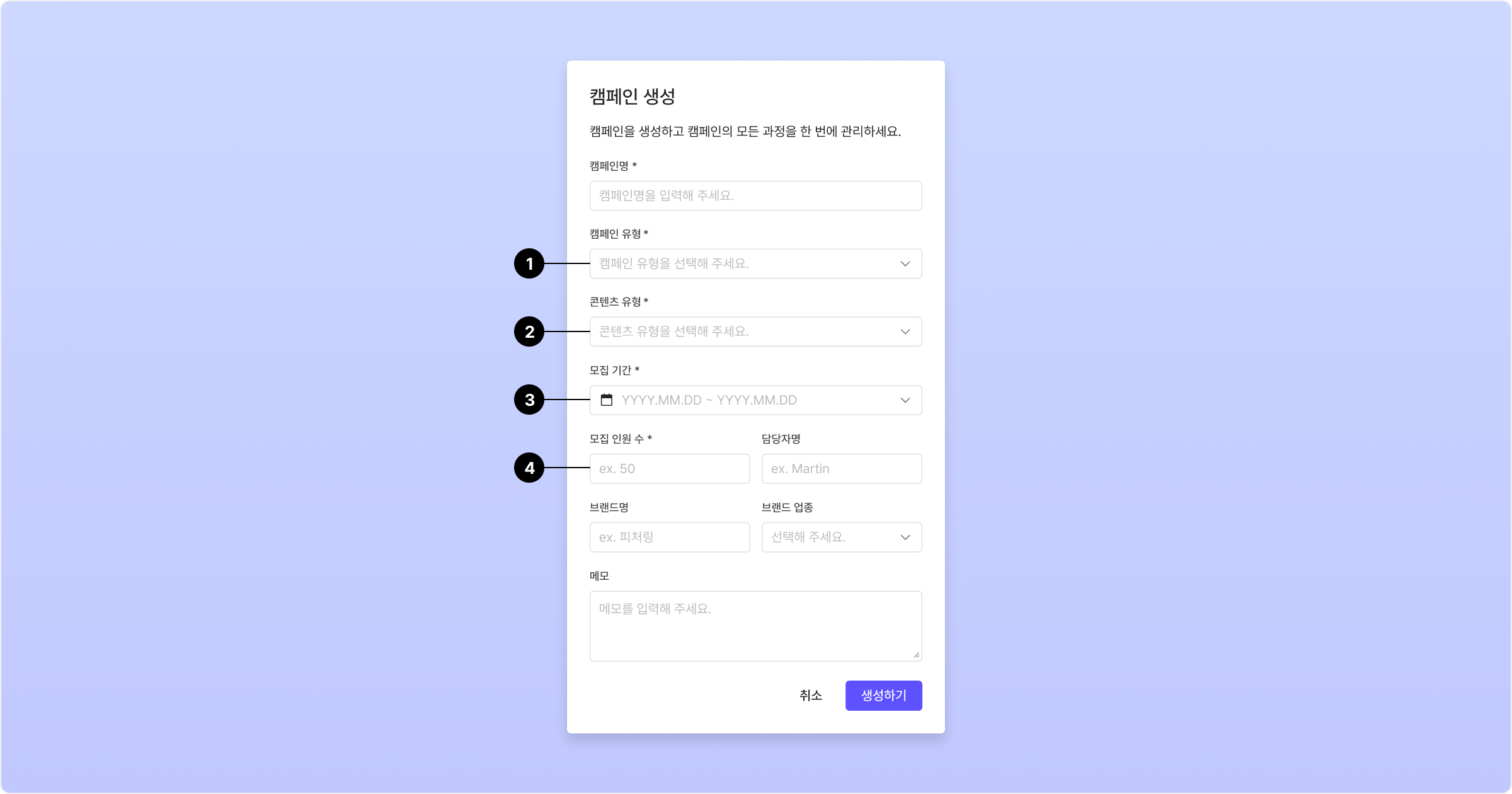 캠페인 생성 모달에서 진행할 캠페인의 기본 정보를 입력합니다.