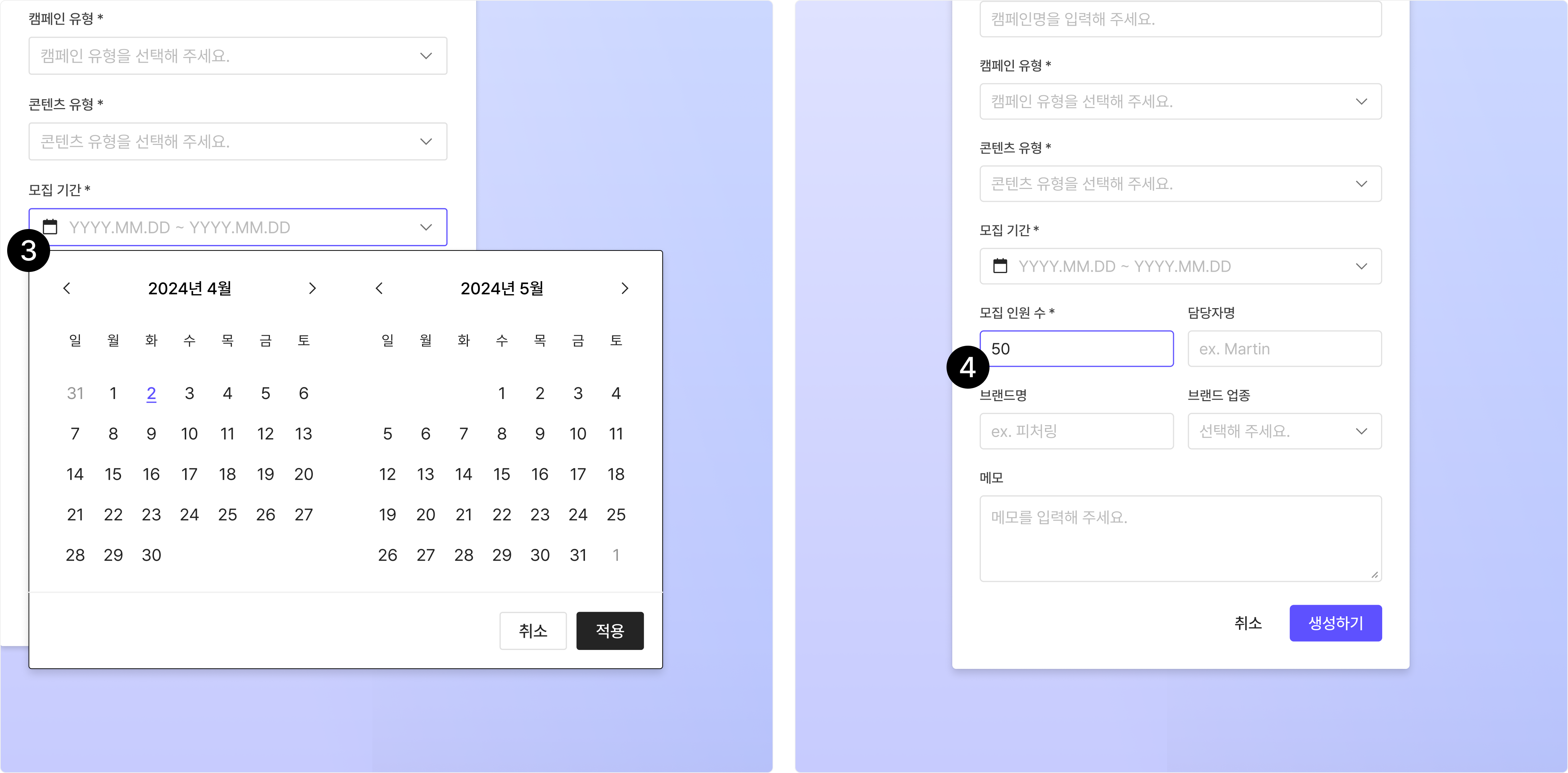 ❸ 모집 기간 설정 후 ❹ 모집 인원 수를 입력합니다.