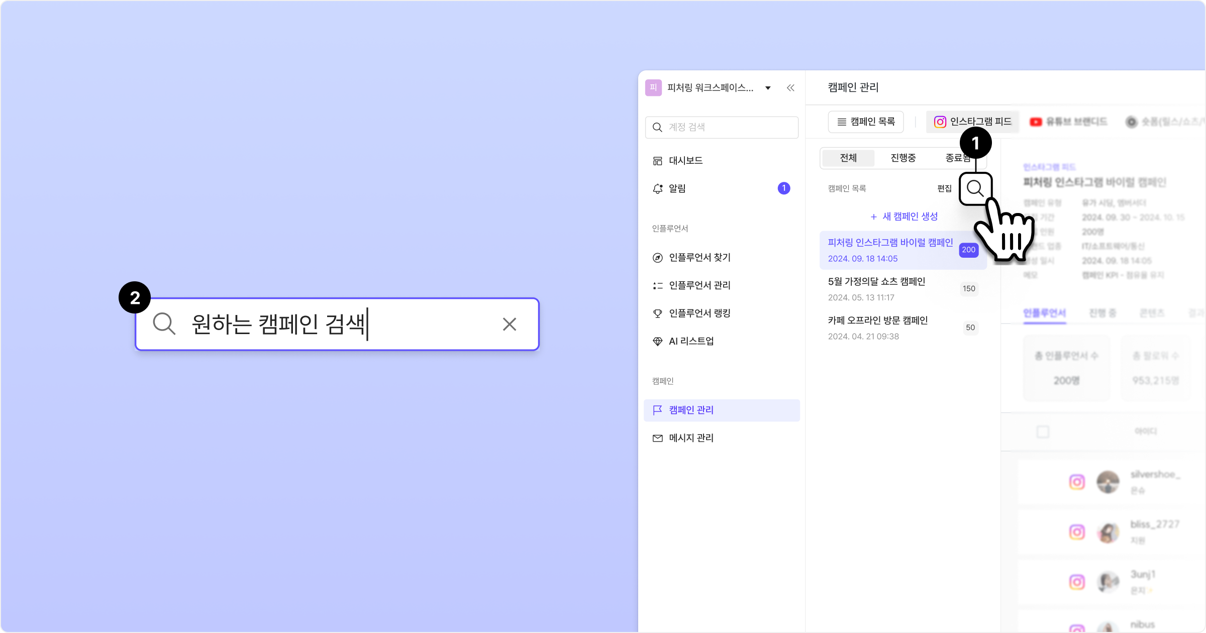 좌측 캠페인 목록 내 ❶ 돋보기 아이콘 클릭 → ❷ 검색창에 검색어를 입력해 원하는 캠페인을 검색할 수 있습니다.