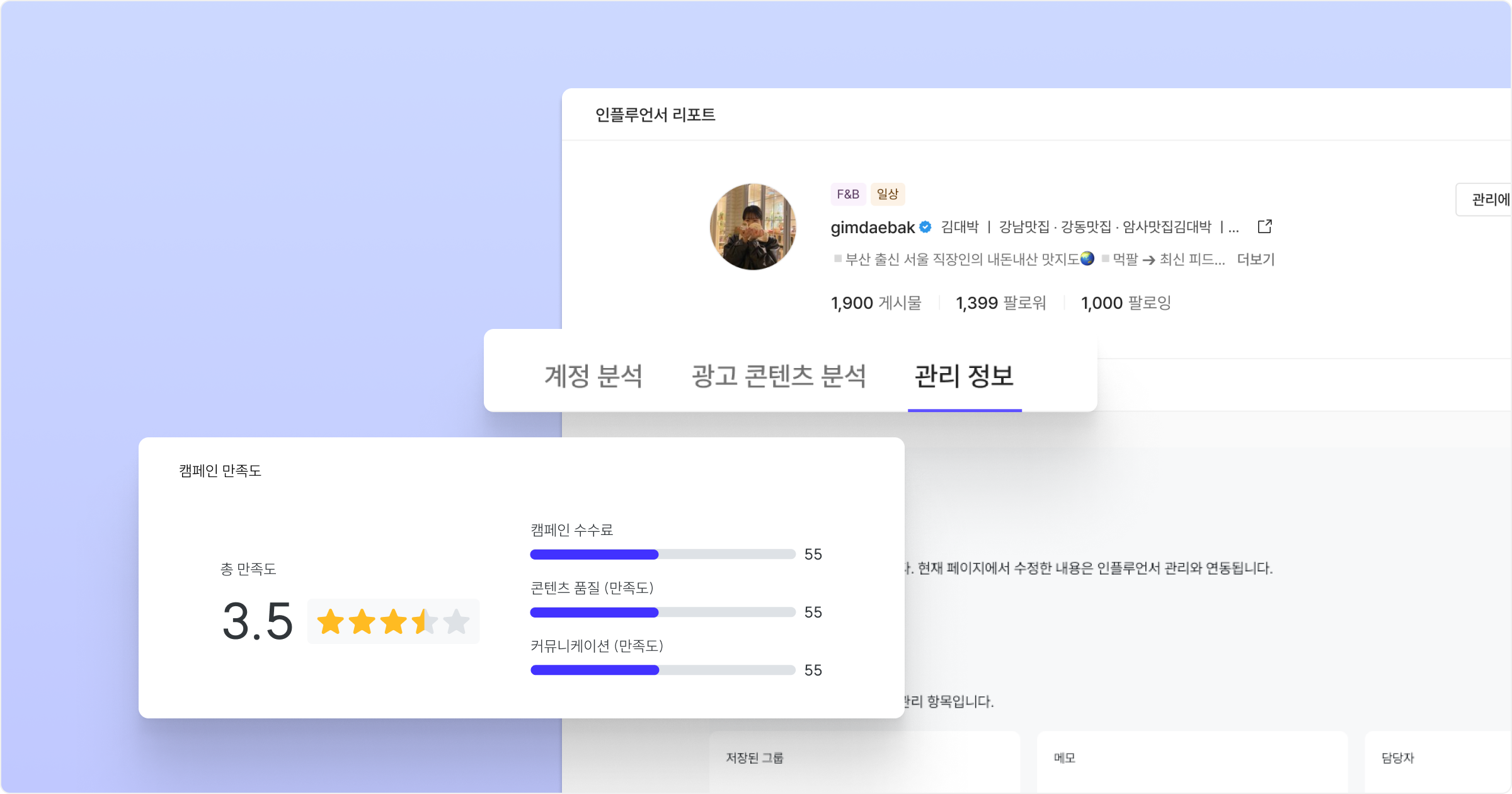 캠페인 만족도평가 결과는 각 인플루언서의 리포트 내 관리 정보 탭에서 확인할 수 있습니다. 인플루언서별 평균 캠페인 만족도를 확인하고 캠페인 섭외 결정에 참고해 보세요.