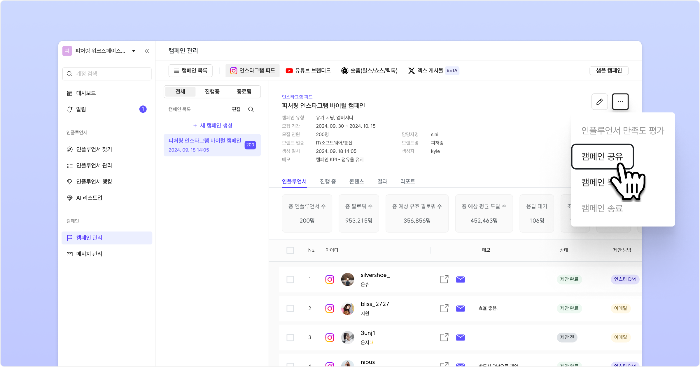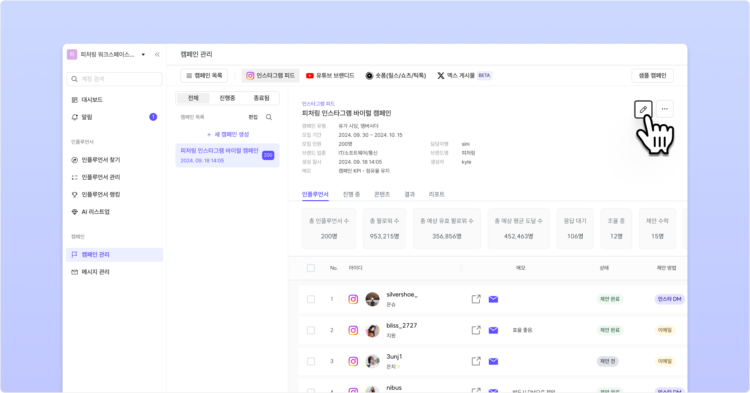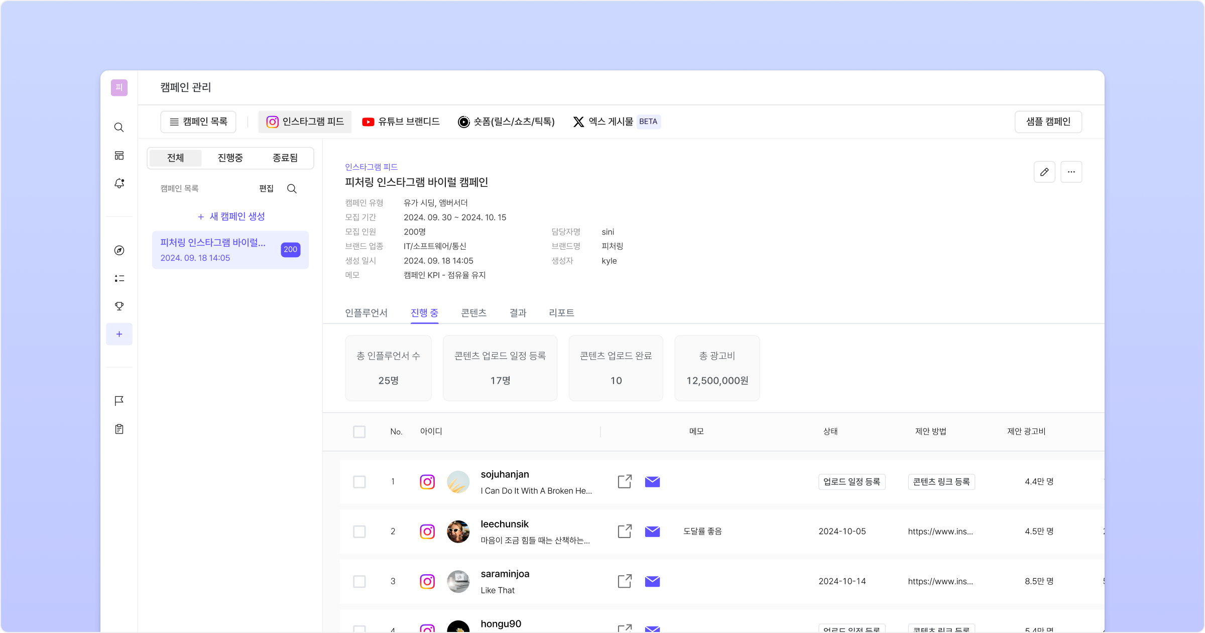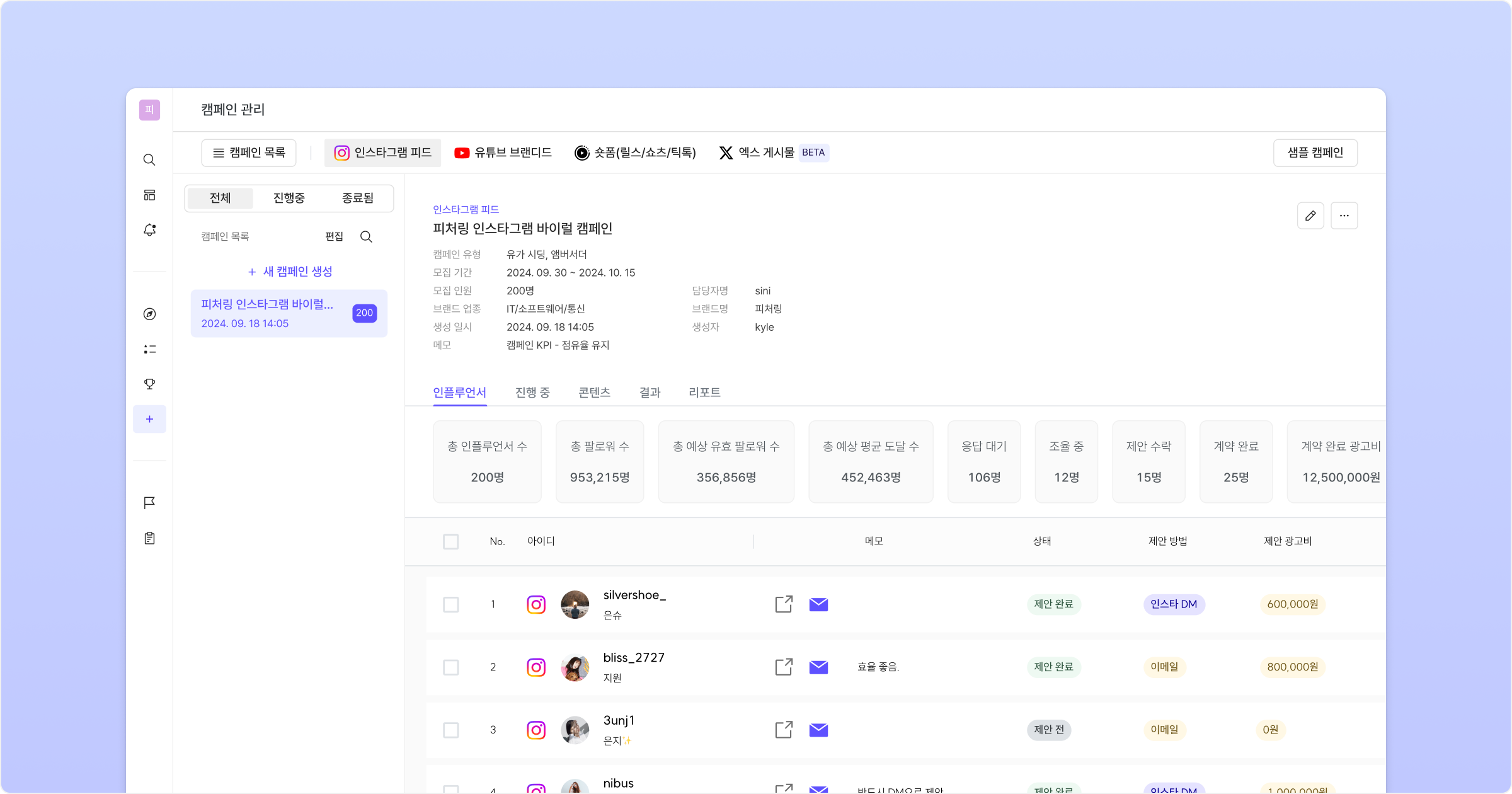 캠페인에 배정된 인플루언서 목록을 확인할 수 있는 탭입니다. 인플루언서의 제안, 계약 상태부터 제안 방법, 제안 광고비까지 한 곳에서 쉽게 관리해 보세요.