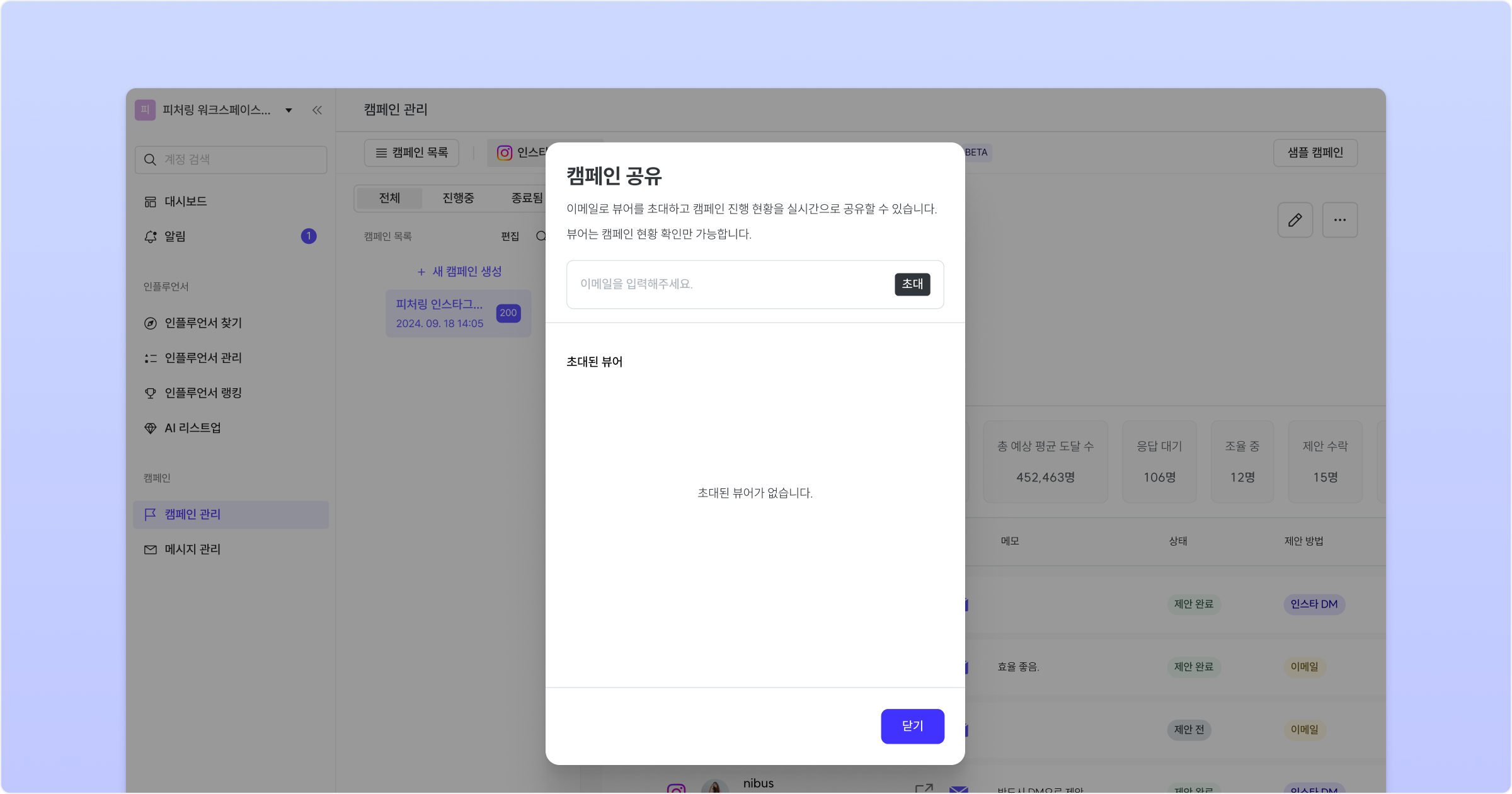 초대한 이메일로 캠페인 현황 페이지의 링크가 공유되며, 해당 링크로 접근 시 뷰어 권한으로 캠페인 현황을 확인할 수 있습니다.