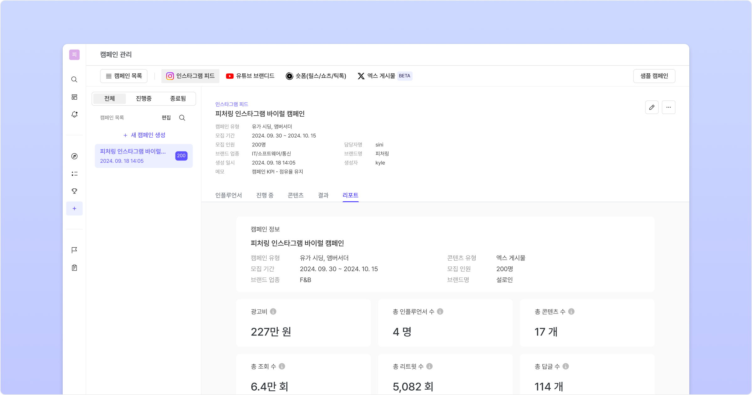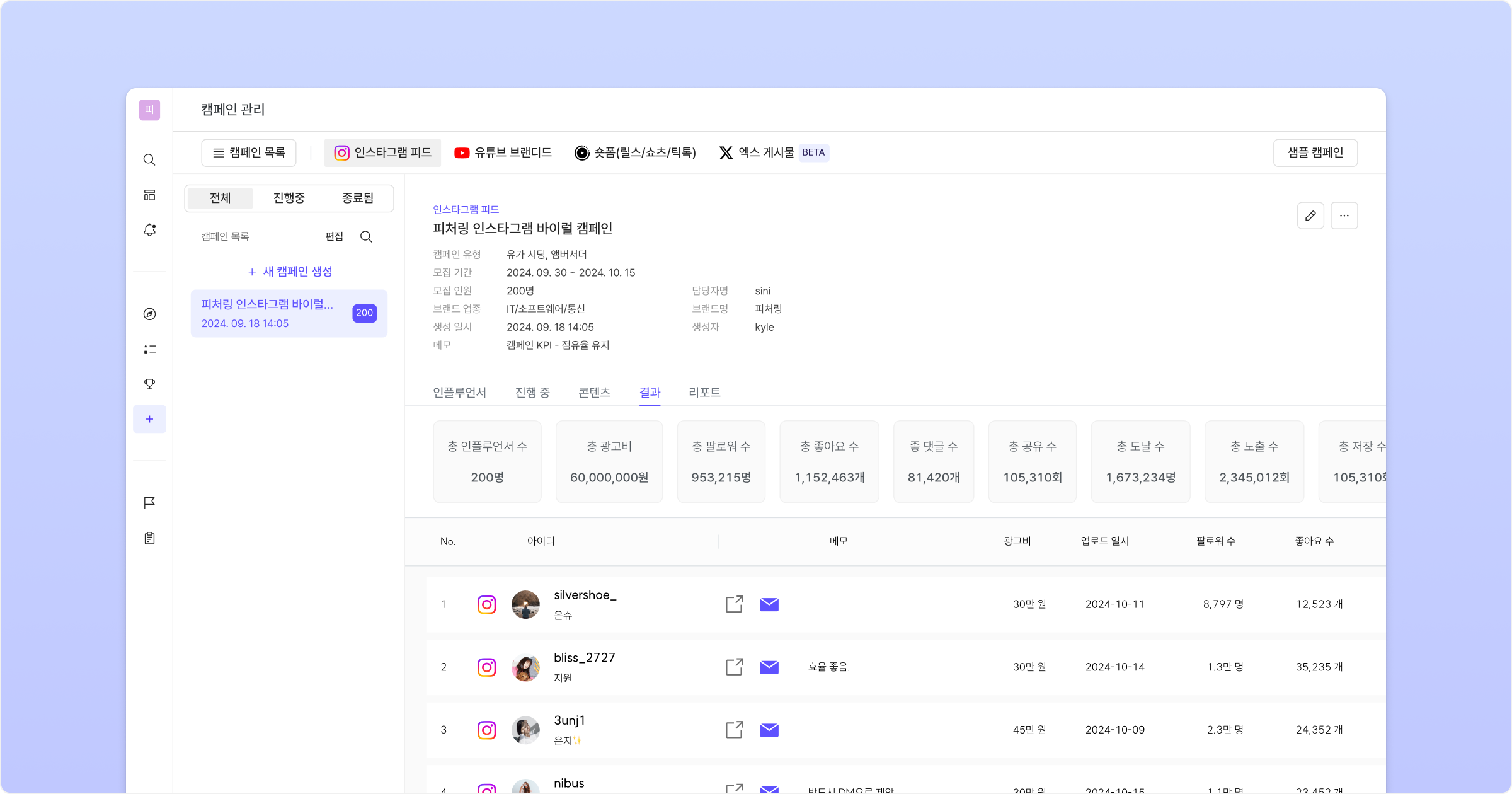 캠페인의 진행 결과를 확인할 수 있는 탭입니다. 자동으로 수집되는 결과 데이터를 확인할 뿐만 아니라, 인플루언서에게 직접 수집한 인사이트 정보를 입력하여 보다 풍부한 캠페인 결과 리포트를 받아 보세요.