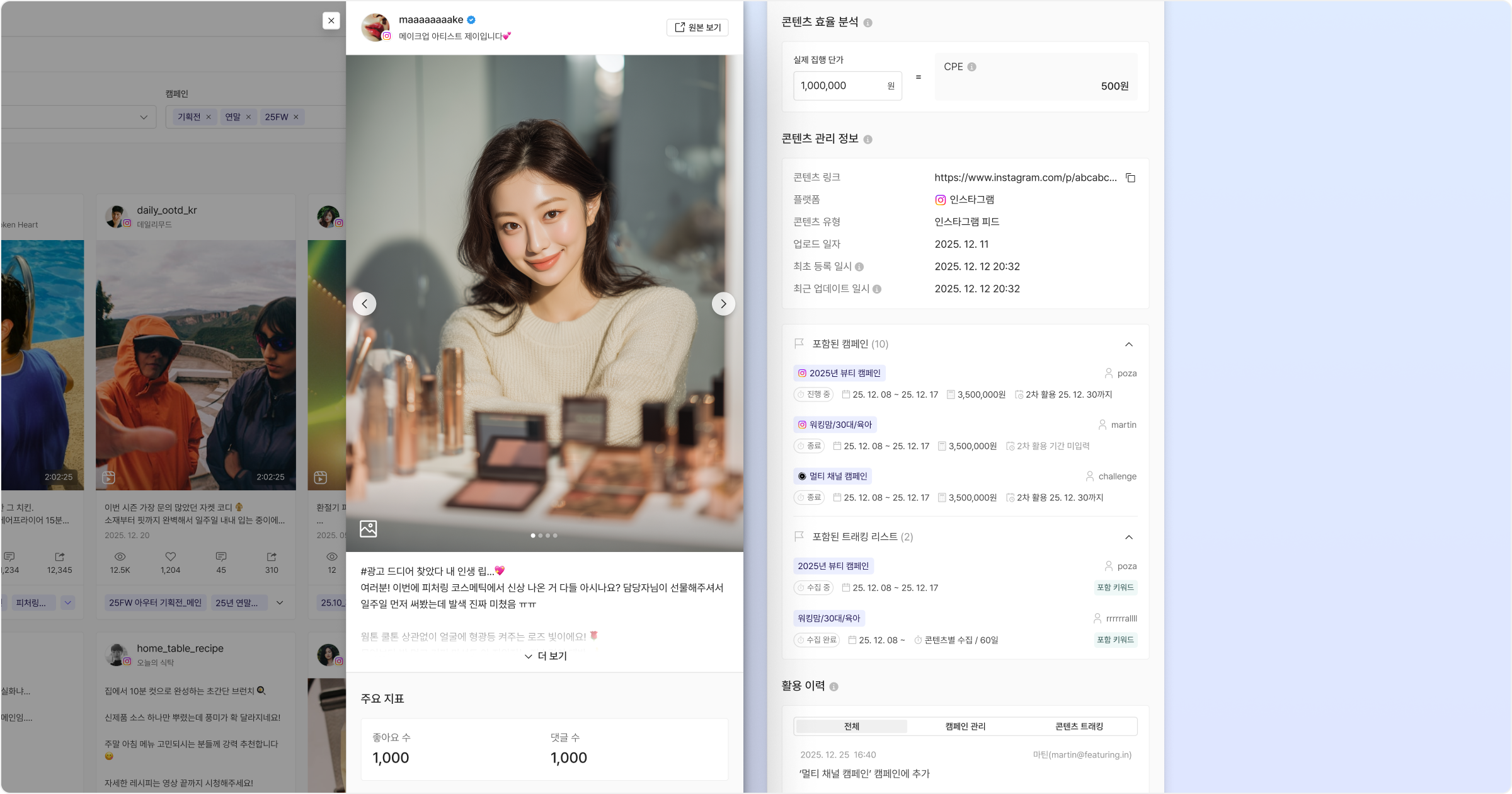 콘텐츠 상세 정보 화면은 특정 인플루언서가 게시한 콘텐츠의 이미지/영상, 주요 성과 수치, 내용(제목/본문) 등을 직관적으로 확인할 수 있는 기능입니다. 콘텐츠 중심의 레이아웃으로 설계되어, 인플루언서 계정과는 별개의 단위로 세부 분석 및 의사결정이 가능합니다