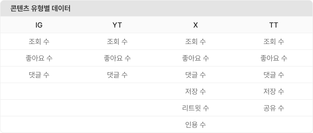 콘텐츠 정보, 계정, 수집 조건, 주요 지표(조회 수/좋아요/댓글/공유 수 등)가 목록 형태로 표시됩니다.