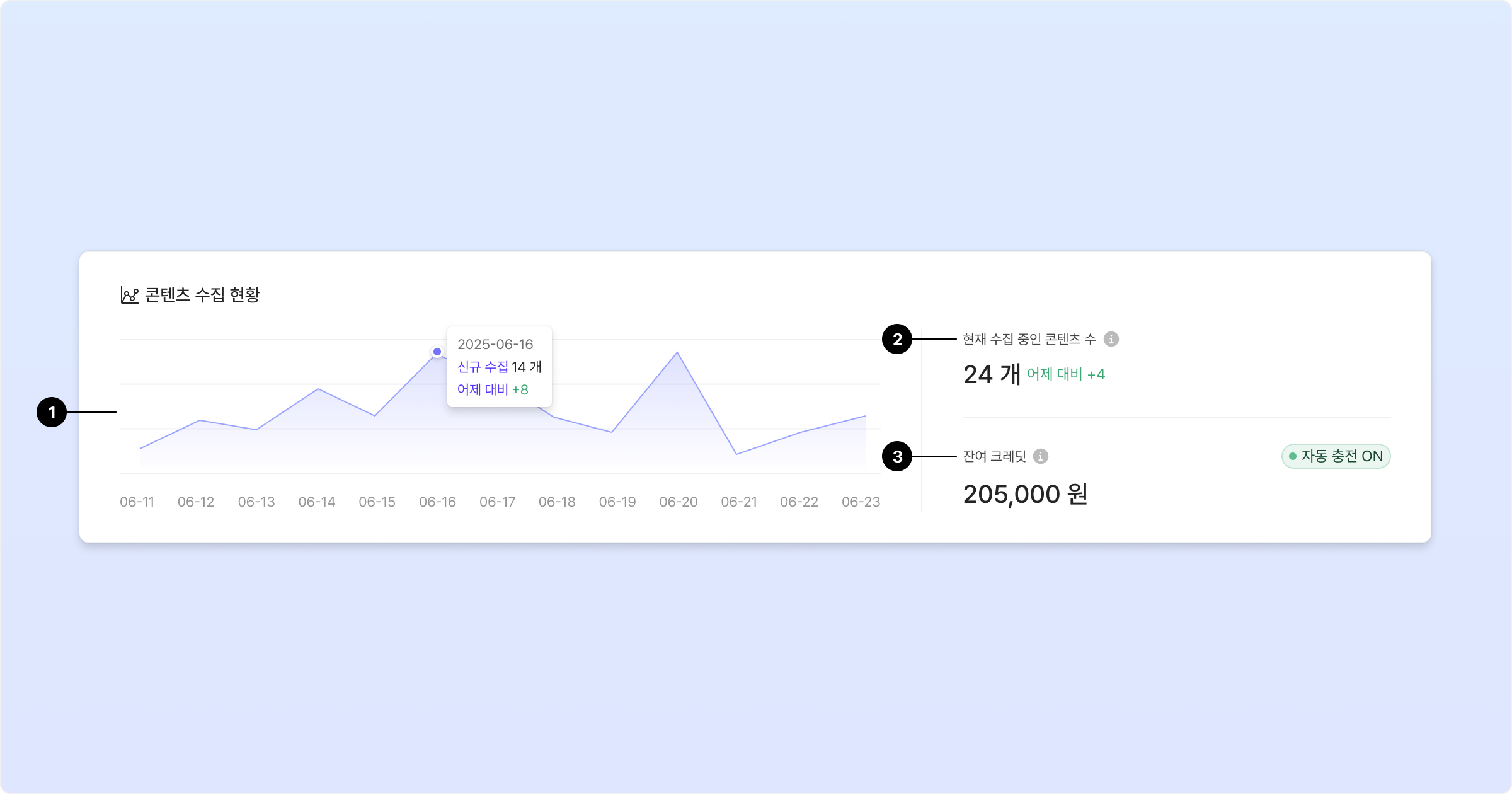 콘텐츠 수집 현황 그래프를 통해 날짜별 콘텐츠 수집 추이를 시각적으로 확인할 수 있습니다.