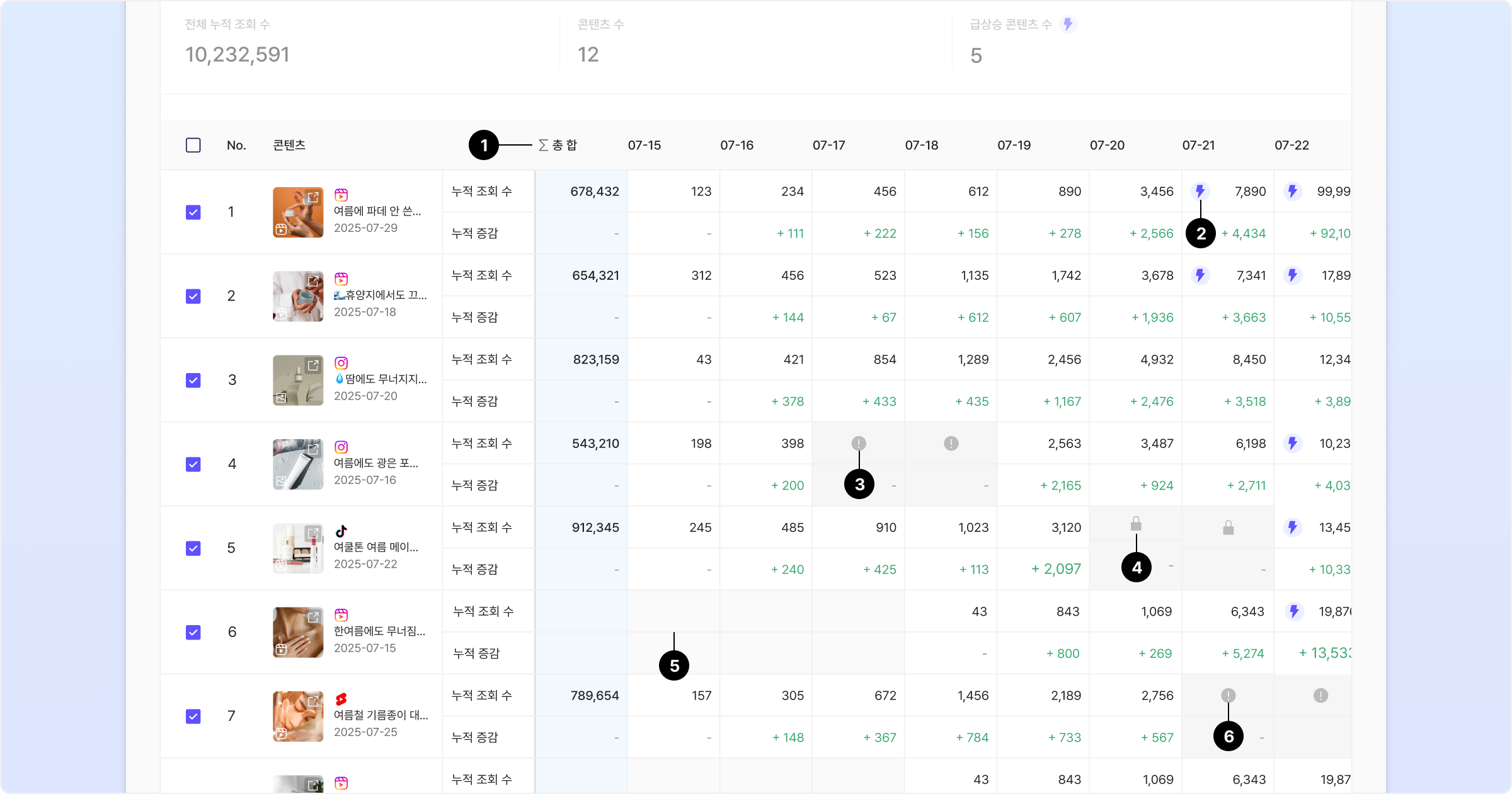 ➊ 총 합: 표의 최좌측에는 해당 콘텐츠 지표의 총 합이 표시됩니다.
