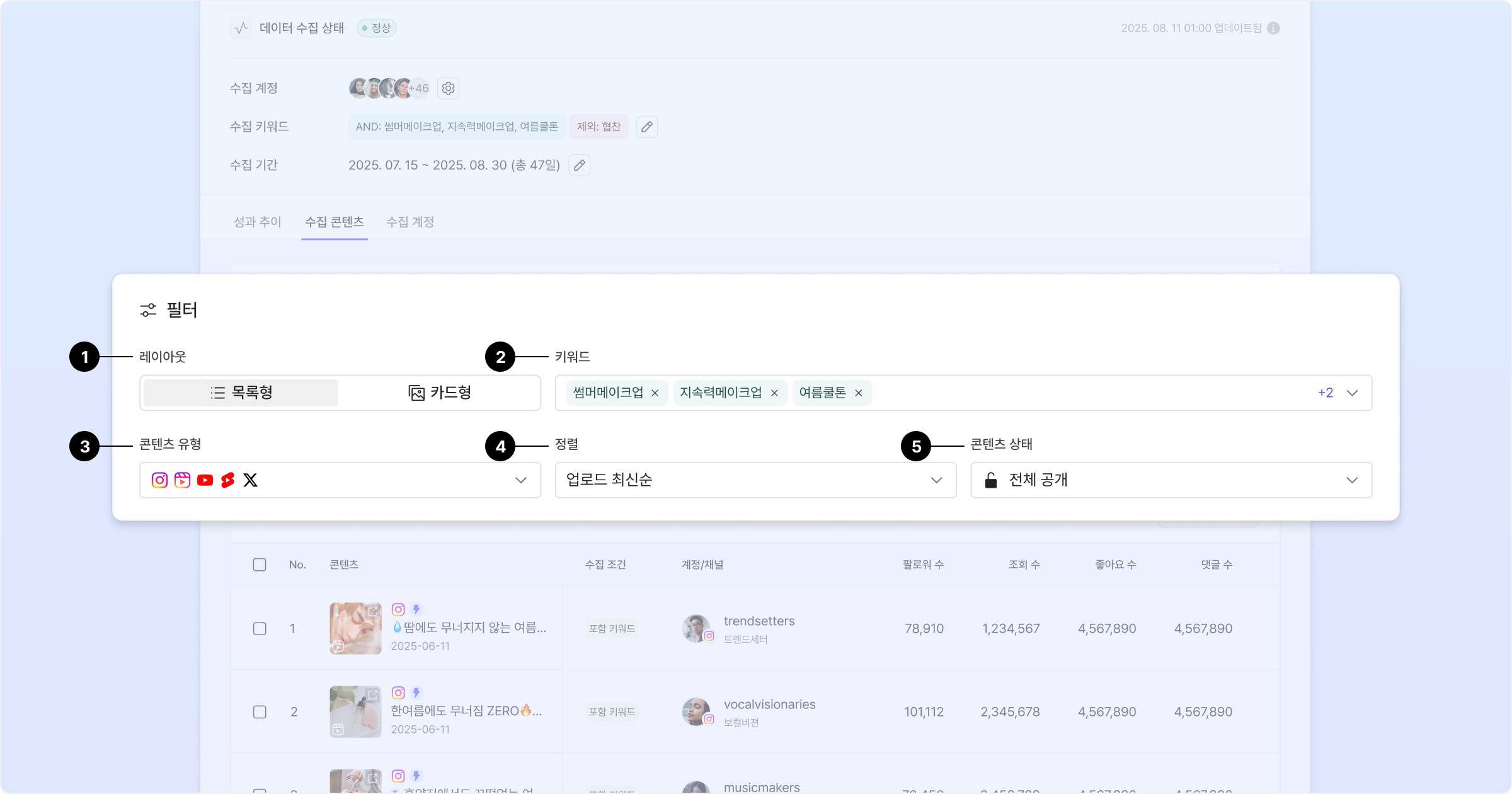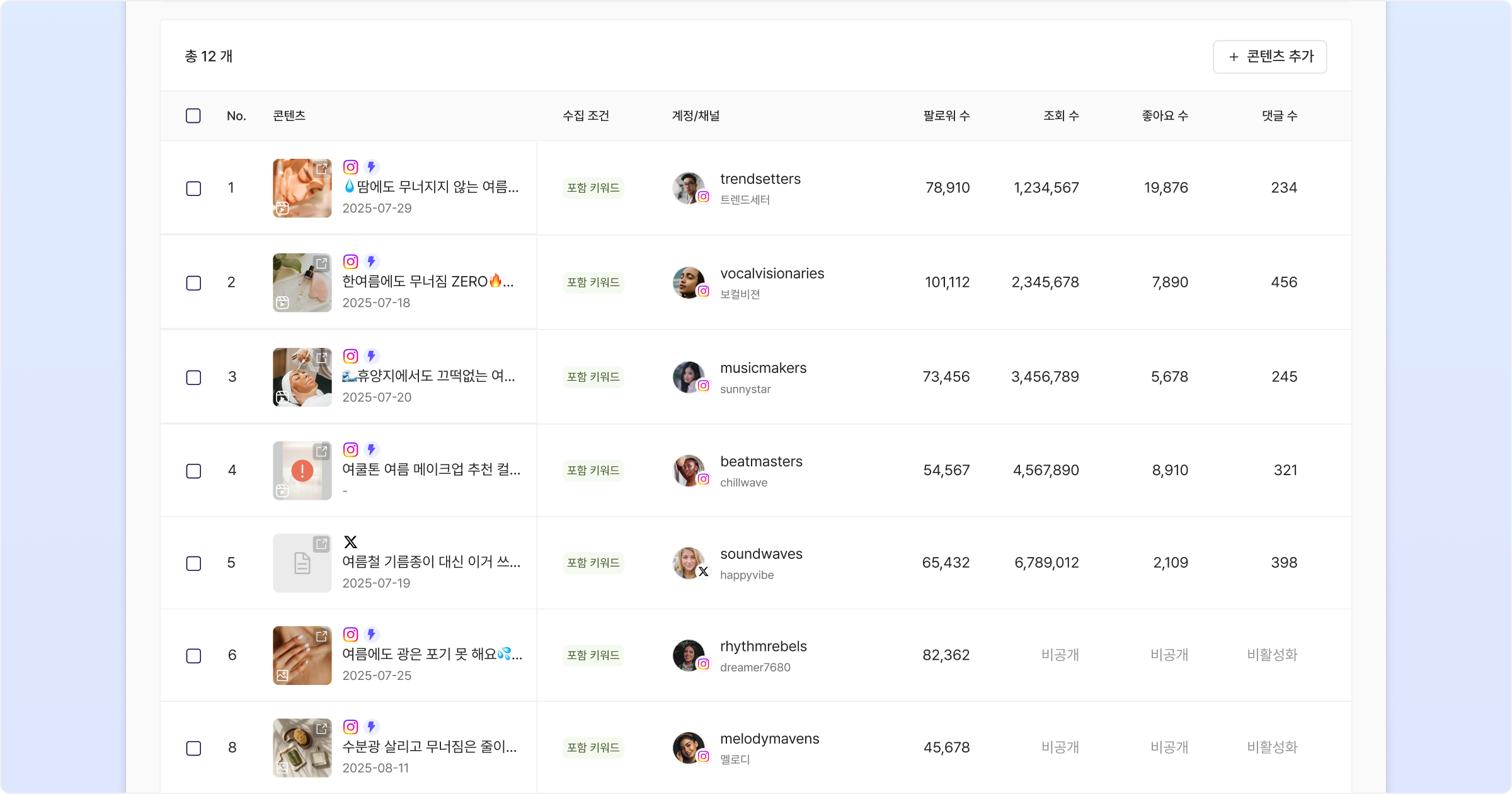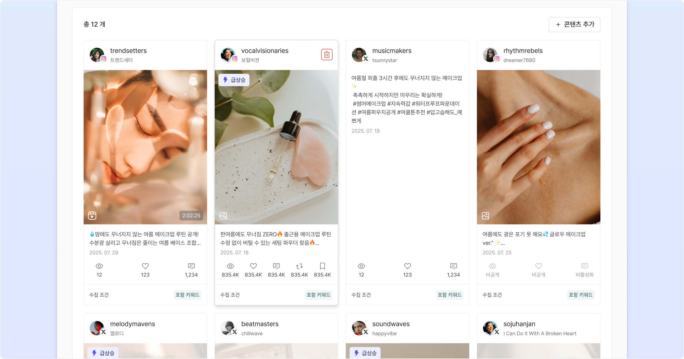 수집 조건에 따라 수집된 콘텐츠들을 확인하고, 필요에 따라 콘텐츠를 직접 추가하거나 삭제할 수 있습니다. 목록형과 카드형 두 가지 레이아웃을 지원하며, 콘텐츠의 주요 지표 및 수집 상태를 한 눈에 파악할 수 있습니다.