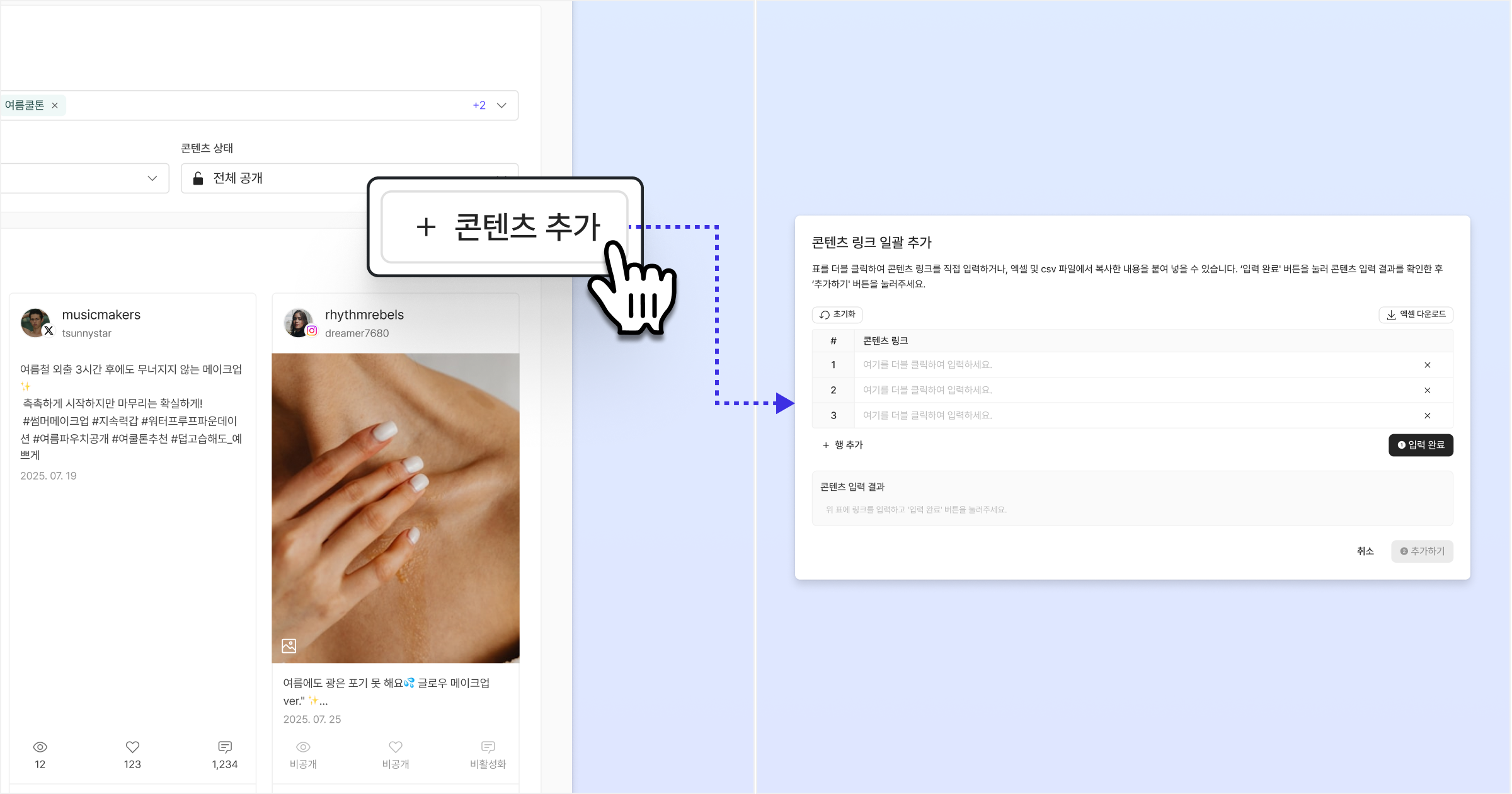 '콘텐츠 추가' 버튼 클릭 후 나타나는 '콘텐츠 링크 일괄 추가' 창에서 콘텐츠 링크를 직접 입력해 수동으로 추가할 수 있습니다.
