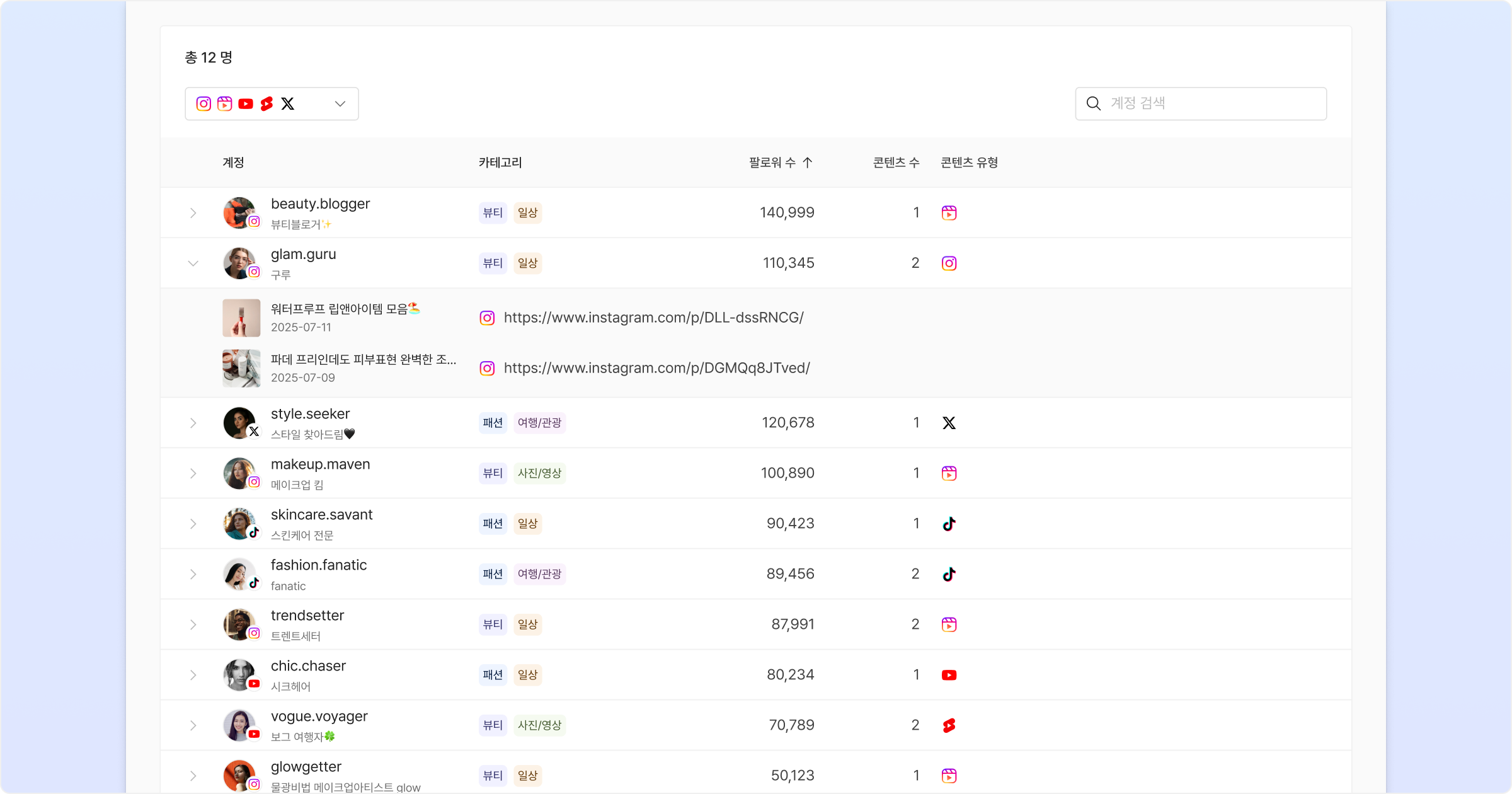 수집 대상으로 추가된 인플루언서들의 계정입니다.