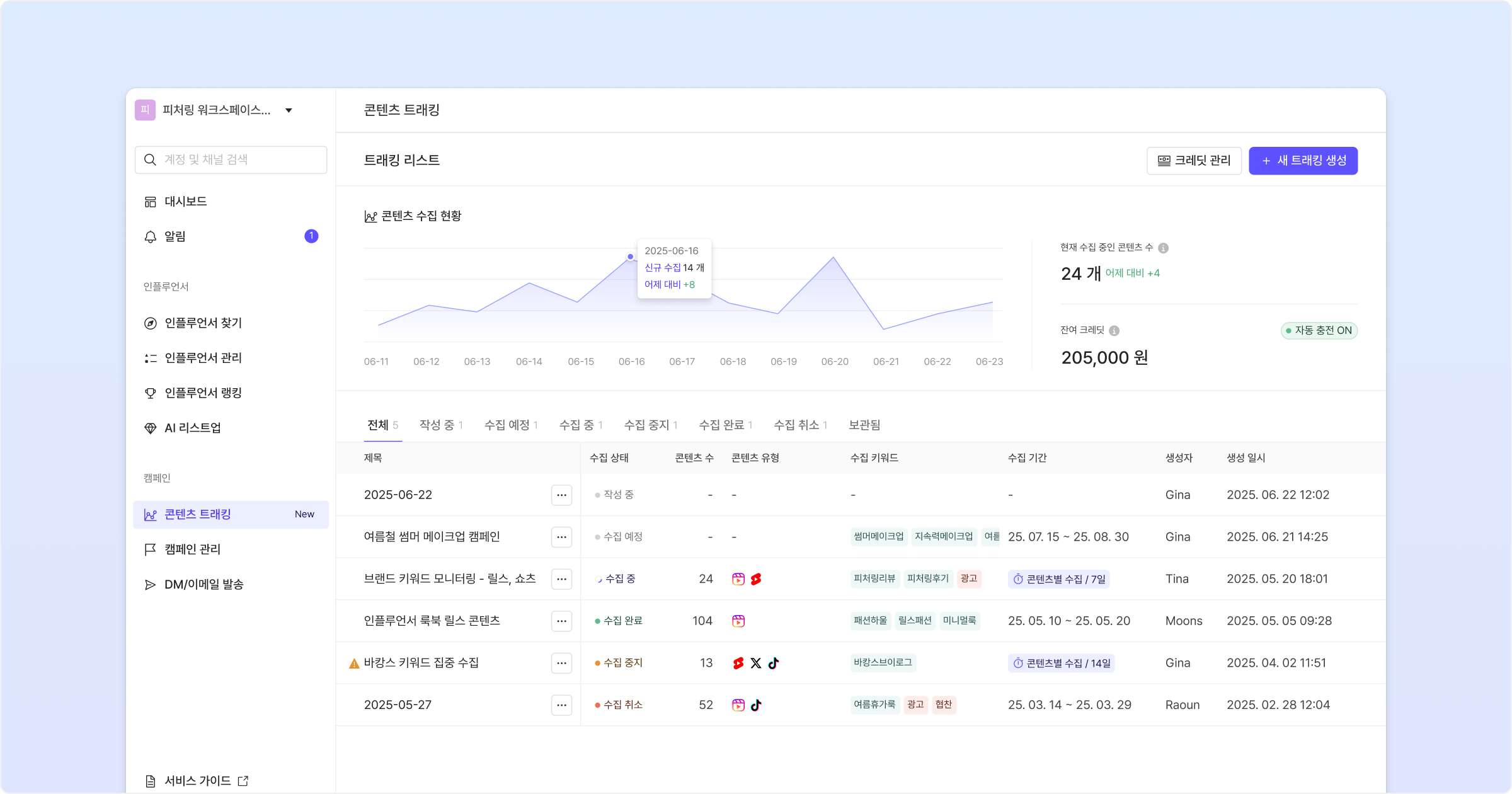 해당 트래킹 리스트에 포함된 인플루언서 계정과 해당 계정으로부터 수집된 콘텐츠 현황을 확인할 수 있습니다.