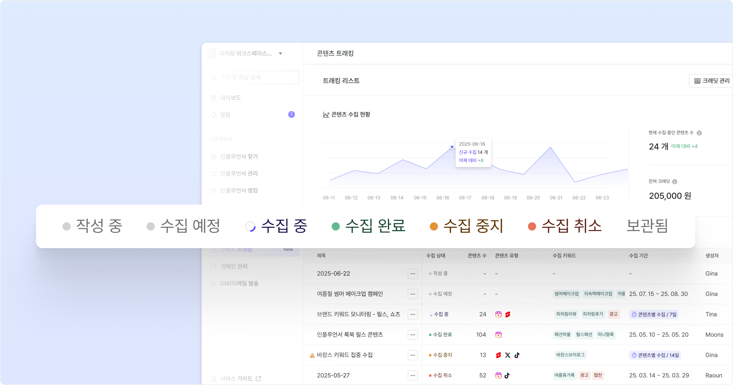 콘텐츠 트래킹 리스트들을 한눈에 확인하고, 현재 수집 상태 및 콘텐츠 성과를 빠르게 파악할 수 있습니다. 리스트별로 수집 상태, 콘텐츠 수, 키워드, 수집 기간 등의 핵심 정보를 확인하고 필요한 작업을 바로 실행할 수 있습니다.